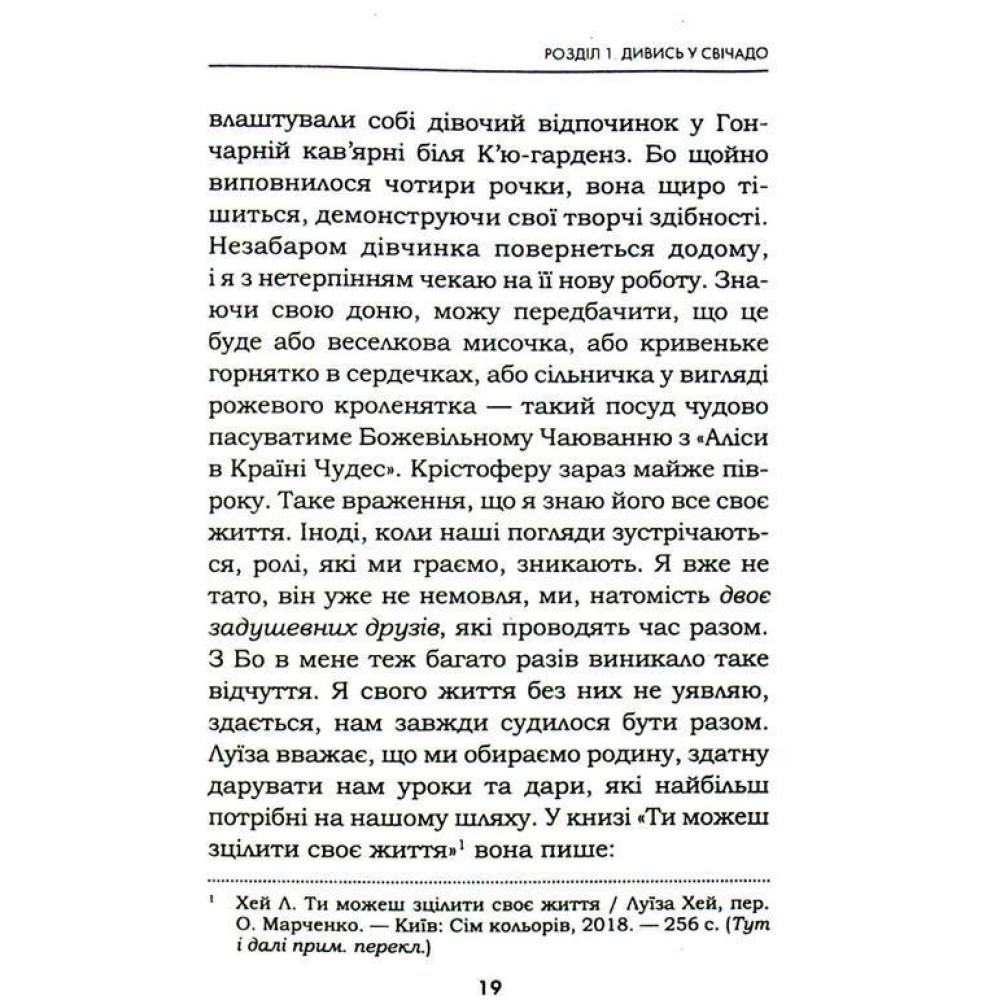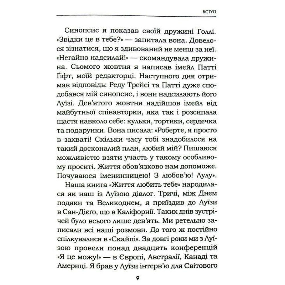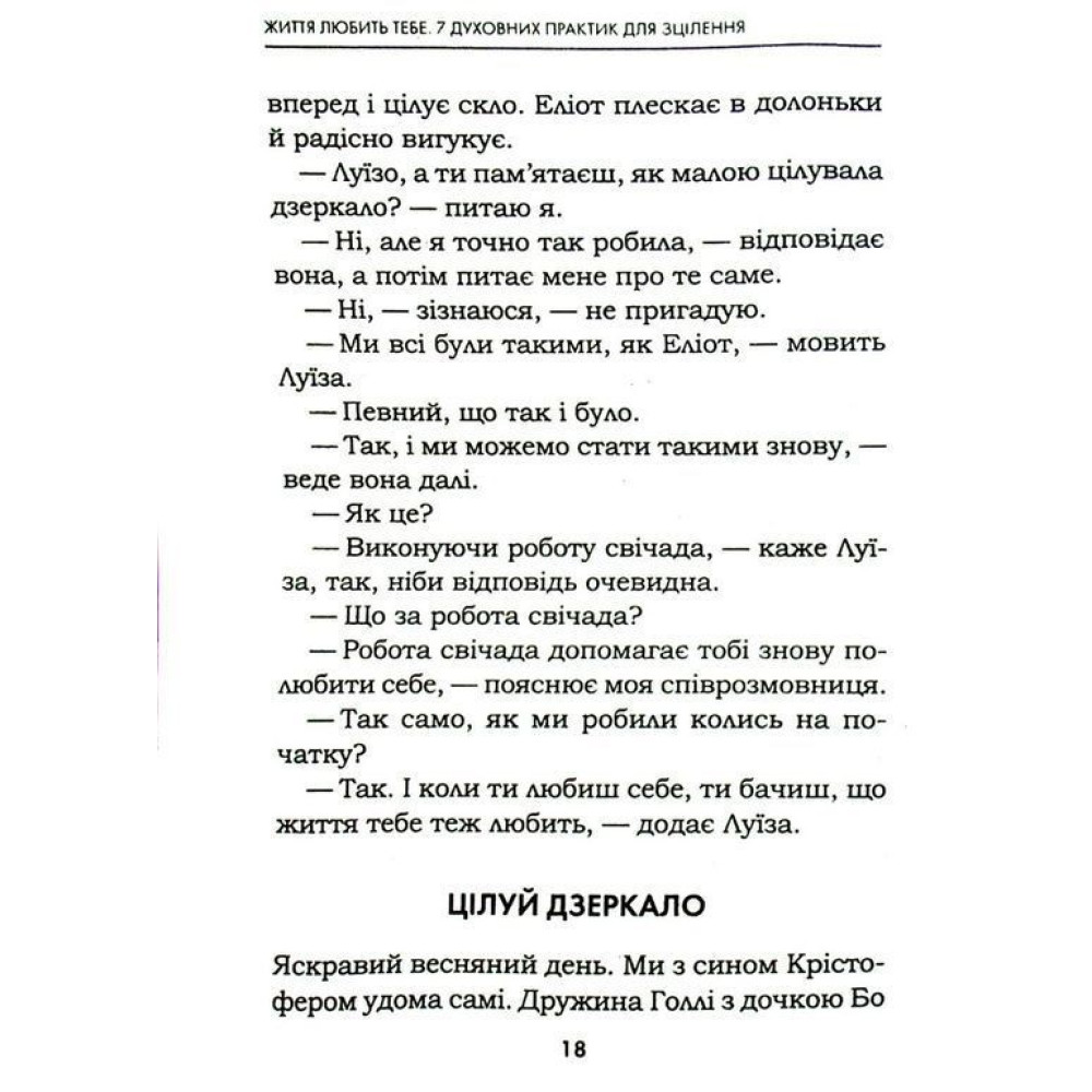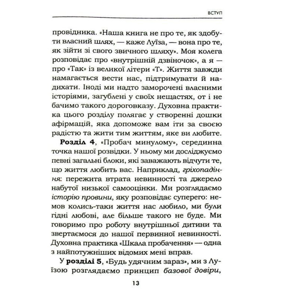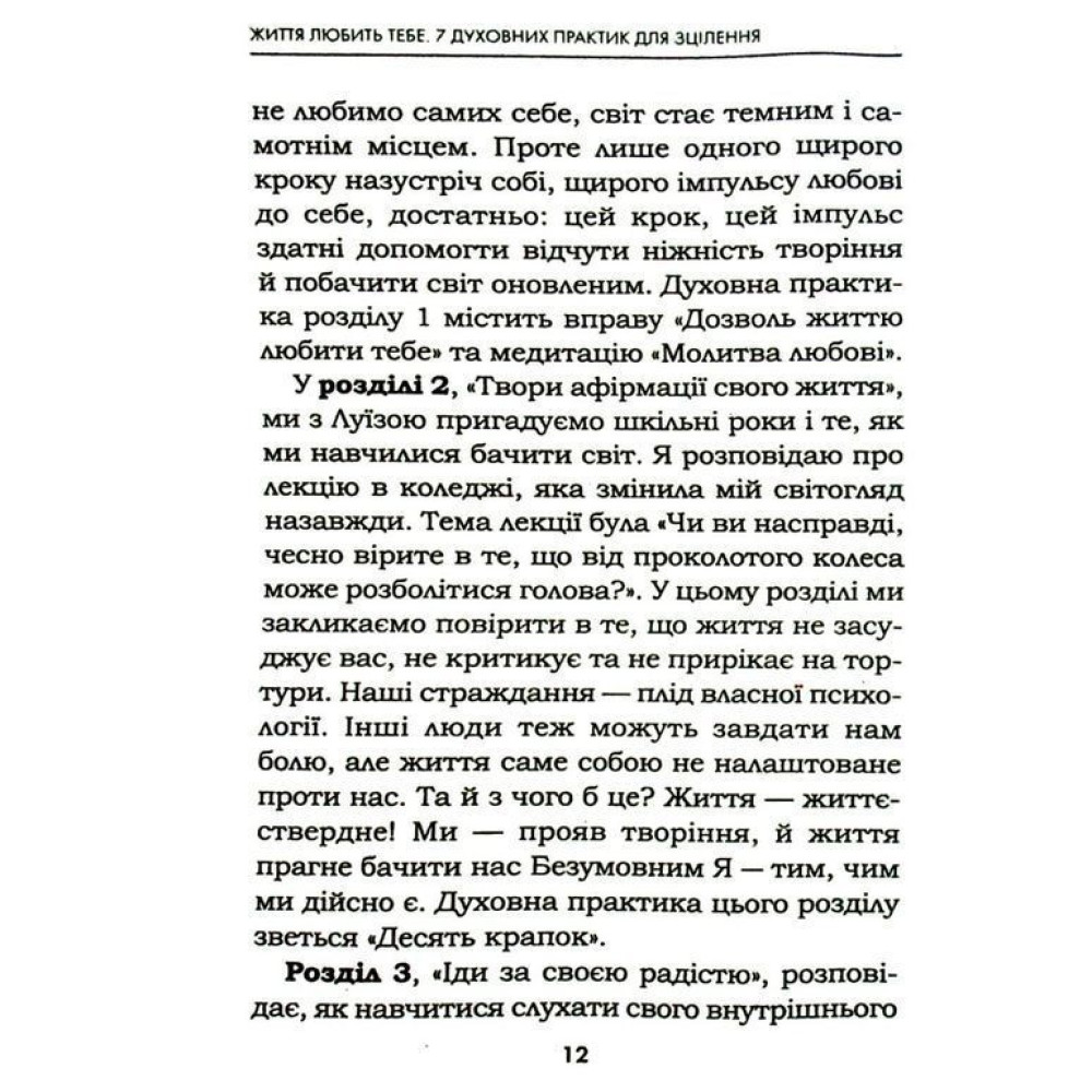 Книжка «Життя любить тебе. 7 духовних практик для зцілення твого життя» від Луїзи Хей і Роберта Холдена — це буквально пошук, що веде кожного з нас у найглибші частини душі, до себе справжнього. Кожен із семи розділів — це сім порад та ключів від дверей, що ведуть до життя мрії. Розділи містять теплі поради, мотивуючі афірмації, аналіз ситуацій та тактики вирішення найскладніших життєвих негараздів. Час дозволити собі любити і відчути любов Усесвіту. Бо любов — мета нашої душі. Ми тут, щоб любити світ. Ми тут, щоб обрати любов, а не страх.
