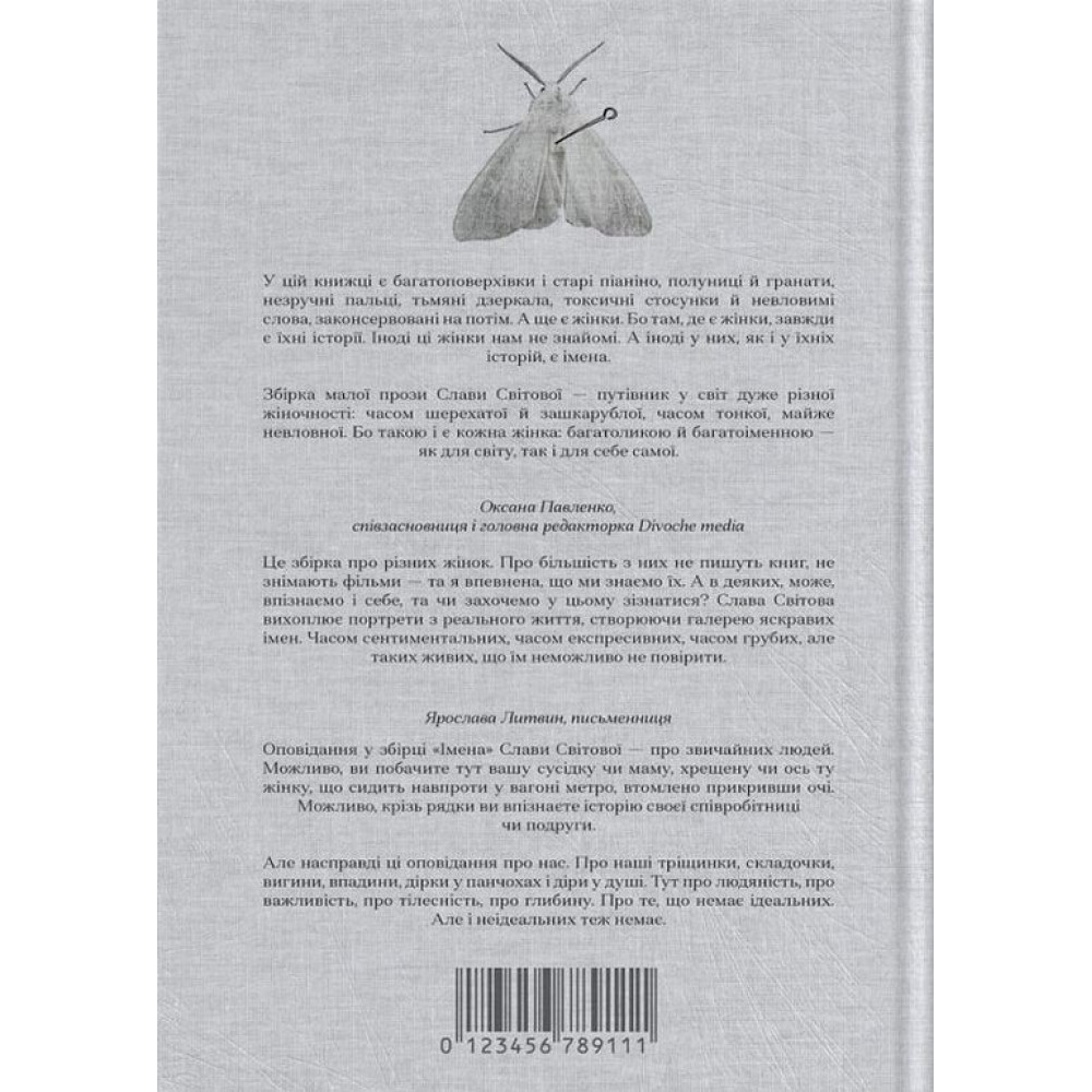 «Імена» за авторством Слави Світової — збірка малої прози (оповідання та повісті) про щемке й ніжне, крихке й незручне, і як його не ховай — воно проступає назовні.