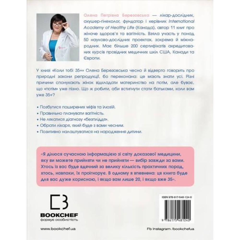У своїй новій книзі «Коли тобі 35+. Як завагітніти й народити дитину» Олена Березовська, авторка бестселера «9 місяців щастя», чесно й відверто говорить про природні закони репродукції, бо переконана: це мають знати усі. Різні причини спонукають жінок відкладати материнство на потім, але буває, що «потім» уже пізно. Лікарка докладно пояснює, що саме відбувається в організмі жінки з віком, чому навіть ті жінки, які «почуваються на 25», не можуть завагітніти в 35 років, і ділиться науково обґрунтованою інформацією про те, як зберегти фертильність.
