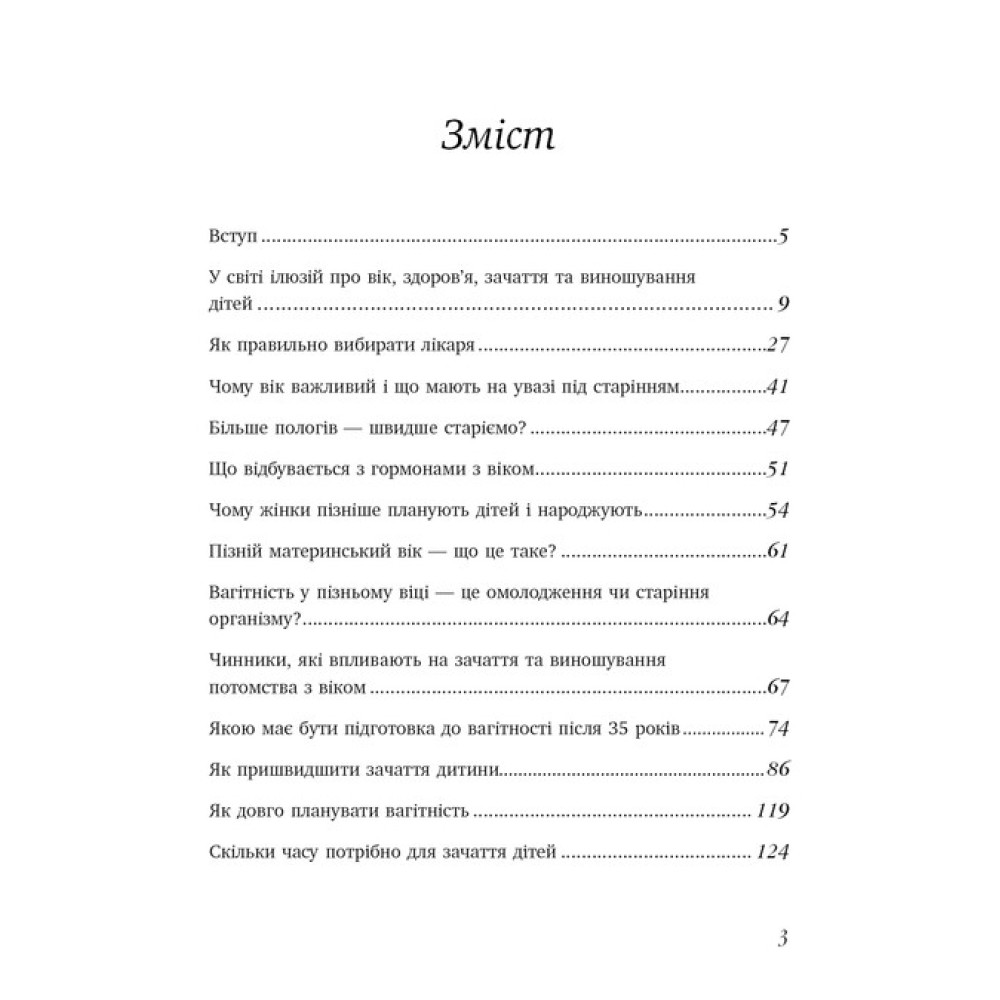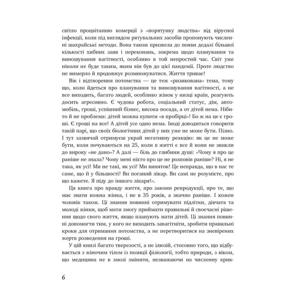 Авторка також докладно висвітлює тему жіночого безпліддя — реального й надуманого, а то й «притягнутого за вуха» тими, хто заробляє гроші, «лікуючи» жінок від відсутніх недуг. Не останньою у вдалому зачатті є й психологічна налаштованість на материнство, про що часто забувають, доводячи жінку до стресу численними аналізами, дослідженнями, очікуваннями, а то й звинуваченнями. Важливим є розділ про підводне каміння пізньої вагітності. Вона доступно пояснює, які відхилення може мати плід, які аналізи потрібно здати, щоб вчасно дізнатися про потенційну небезпеку, а також розповідає, що варто робити, аби уникнути ускладнень вагітності за наявності супутніх хвороб.
