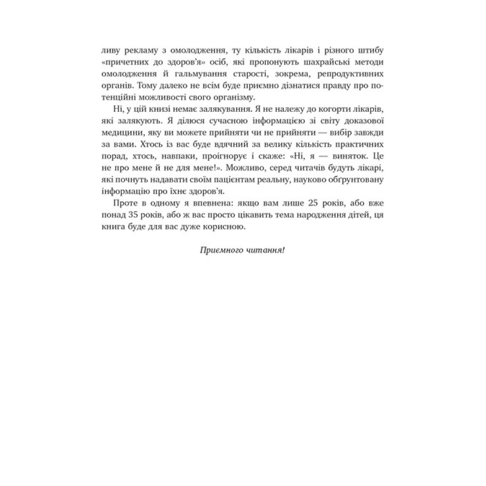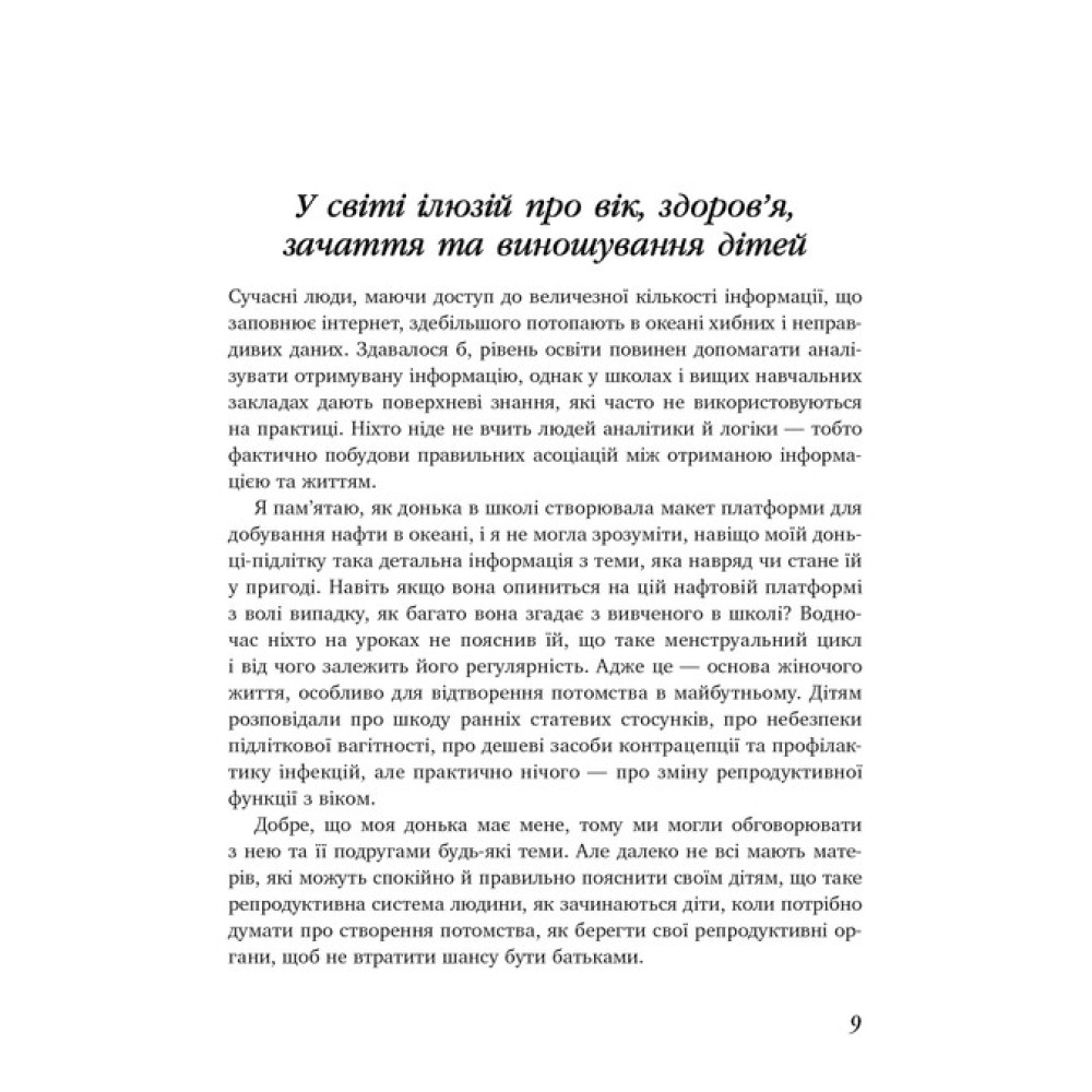 Багатьом жінками об’єктивно оцінити можливості свого організму заважають ілюзії й міфи, які підтримуються малоосвіченими знайомими й недоброчесними лікарями. Саме їх розвінчанням і починається книга. А щоб зрозуміти, що каже лікар і чи чесний він із вами, буде добре озброїтися базовими знаннями про те, як працює репродуктивна система жінки, які гормони беруть участь у регуляції циклу, дозріванні яйцеклітин і виношуванні дитини, як дізнатися, коли найвищі шанси завагітніти, й не пропустити шансу.