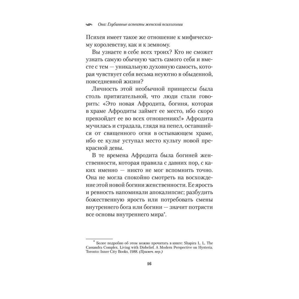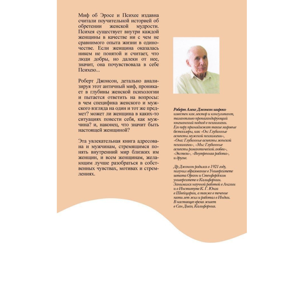 Захоплива книжка Роберта Джонсона «Она. Глубинные аспекты женской психологии», що присвячена глибинним проблемам жіночої психології, відповідає на такі запитання: Якою мірою історії життя всіх жінок схожі між собою і в чому полягає їхня істотна психологічна відмінність? Яке місце в житті жінки займають чоловіки на різних етапах її розвитку? Як жінки можуть виявити в собі Психею й Афродіту? Що таке жіноча зрілість?