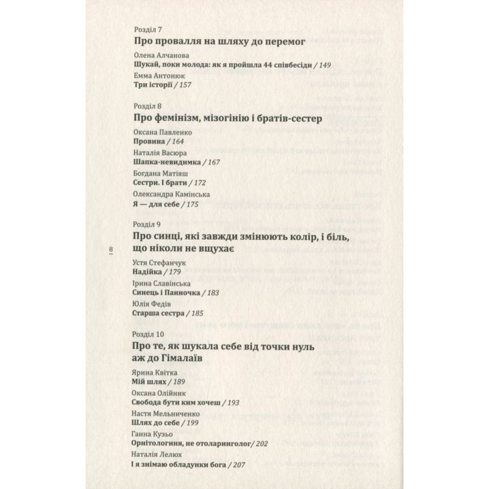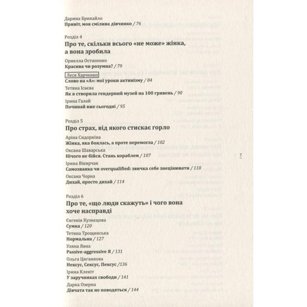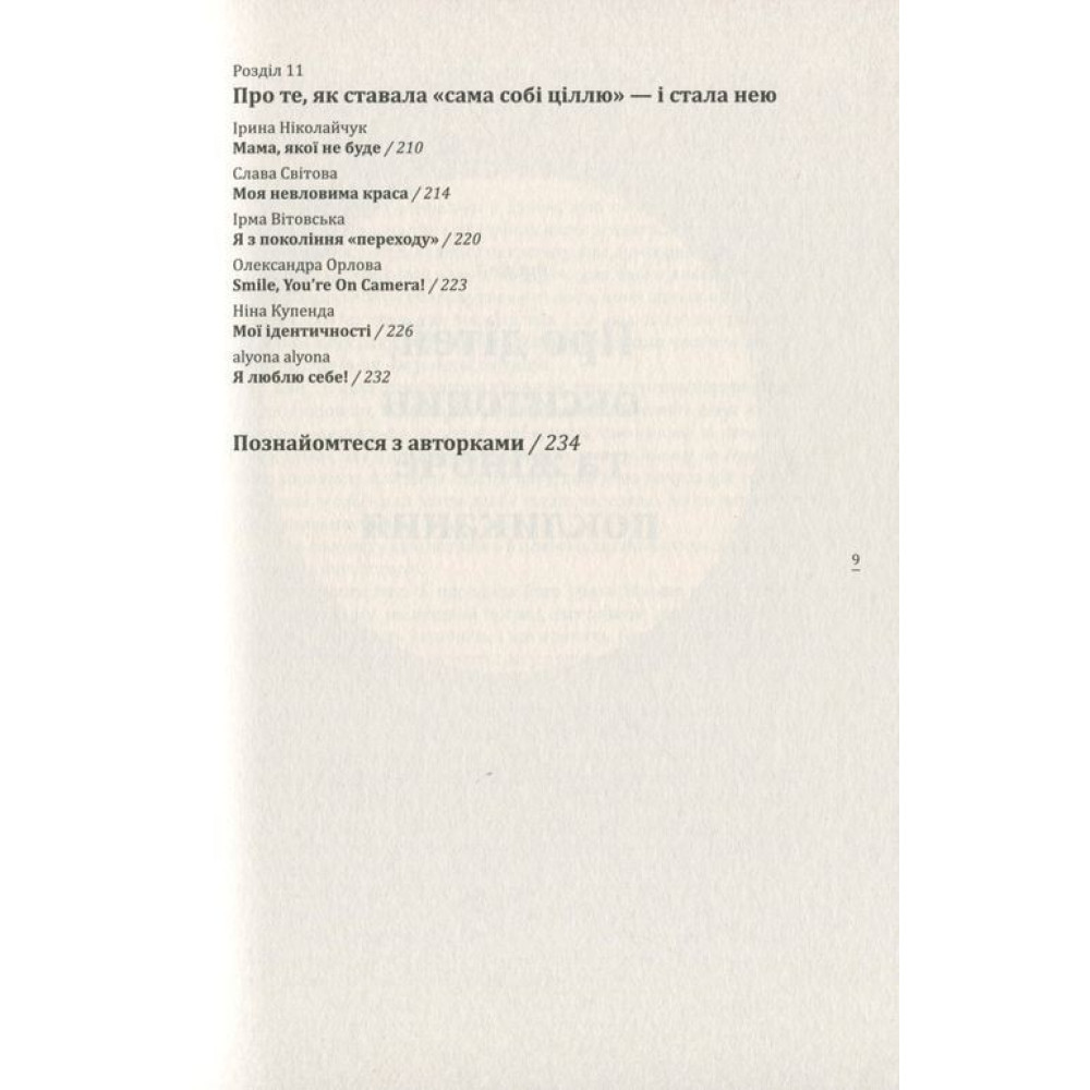 Її можна назвати терапевтичною збіркою, яка бореться з токсичними стереотипами. Книга відразу стала подією, бо серед її авторок є активісти-правозахисники, жінки з цікавими історіями та відомі люди, яким є чи подітися: реперка alyona alyona, акторка Ірма Вітовська, журналістка та літературознавиця Ірина Славінська, письменниця та правозахисниця Лариса Денисенко, лікарка Наталія Лелюх, письменниця Анна Топіліна та багато інших.