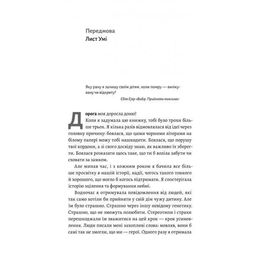 Відповіді на ці питання авторка шукала, коли вирішила написати власну історію та поділитись своїм досвідом усиновлення. Пошуки привели її до абсолютно інакших викликів — як полюбити свою внутрішню дитину? Як прийняти в собі ту маленьку дівчинку, що прагне свободи та проявлення і просто дозволити їй бути?