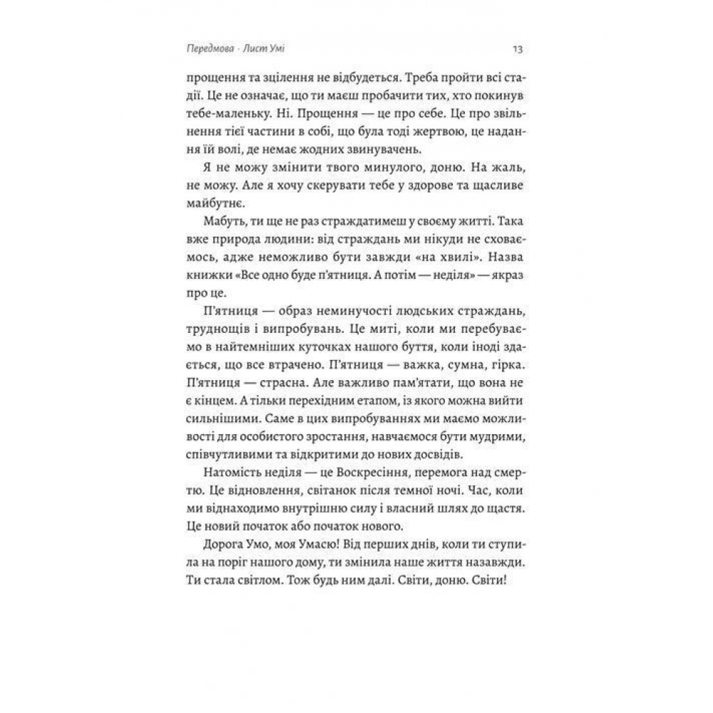 «Чи можливо полюбити чужу дитину, як свою кровну?», «Що заважає на цій площині зійтись лініям?», «Чому в цьому місці є так багато страхів, стереотипів та упереджень, які не дають проявлятися чистій любові?», — книга «Все одно буде п’ятниця. А потім неділя» Ольги Бартиш пропонує дослідження почуттів звичайної жінки, яка одного разу захотіла допомогти дитині, світові і в першу чергу собі, а не якусь типову розповідь про досвід усиновлення і тим більше не інструкція як діяти, якщо було вирішено відкрити свій дім для дитини.