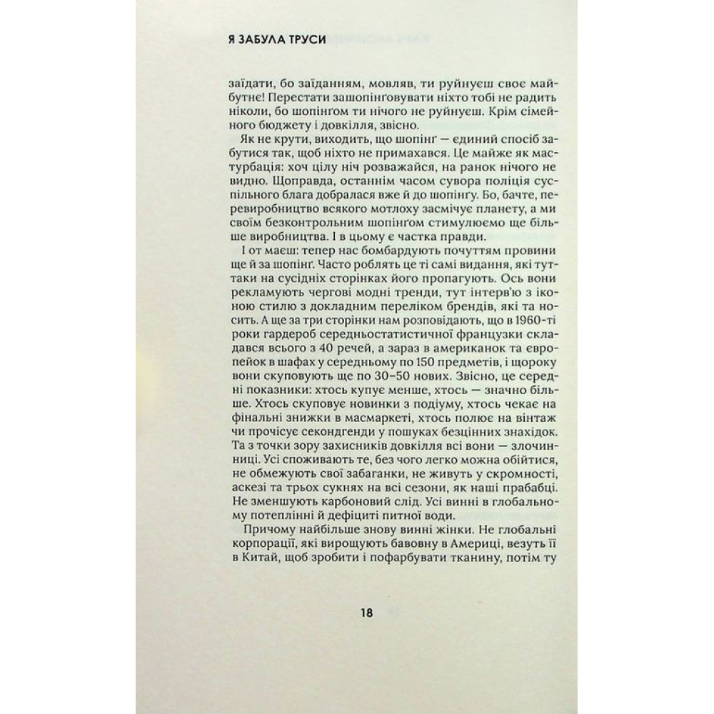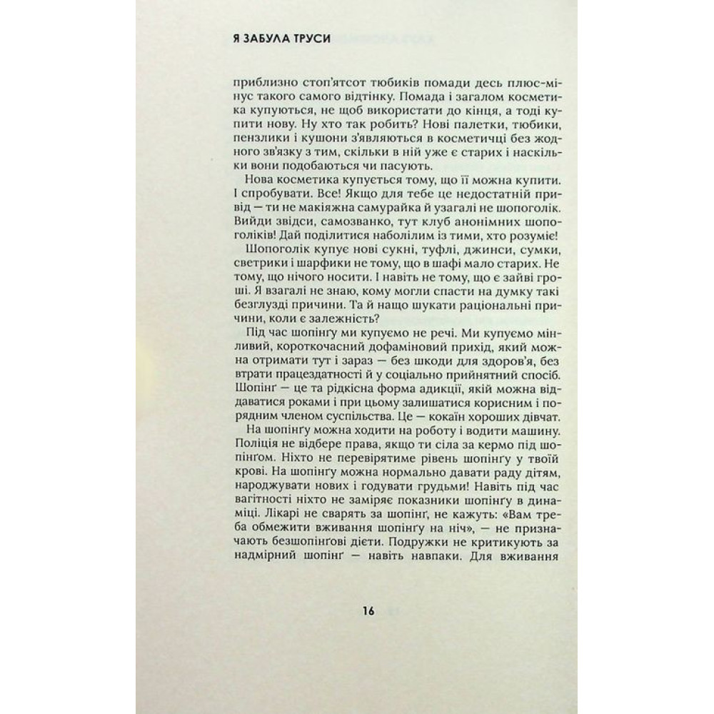 На сторінках книжки «Я забула труси» Майя Тульчинська пише про мізогінію, про місячні, про синдром самозванки, про нерівність у суспільстві так, щоби ми від душі посміялися над цим і щоби цей сміх дав нам сили змінити власне життя та життя інших жінок на краще. У цій книжці ви неодмінно впізнаєте себе й близьких собі жінок.