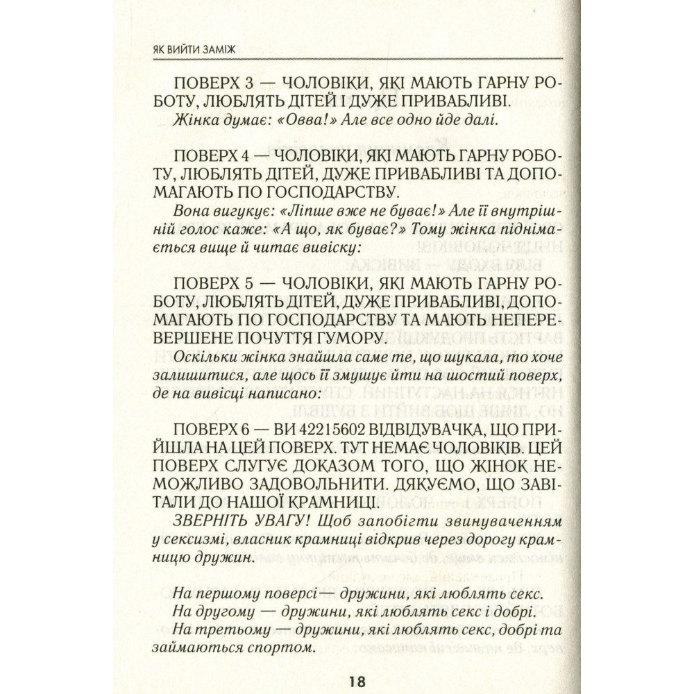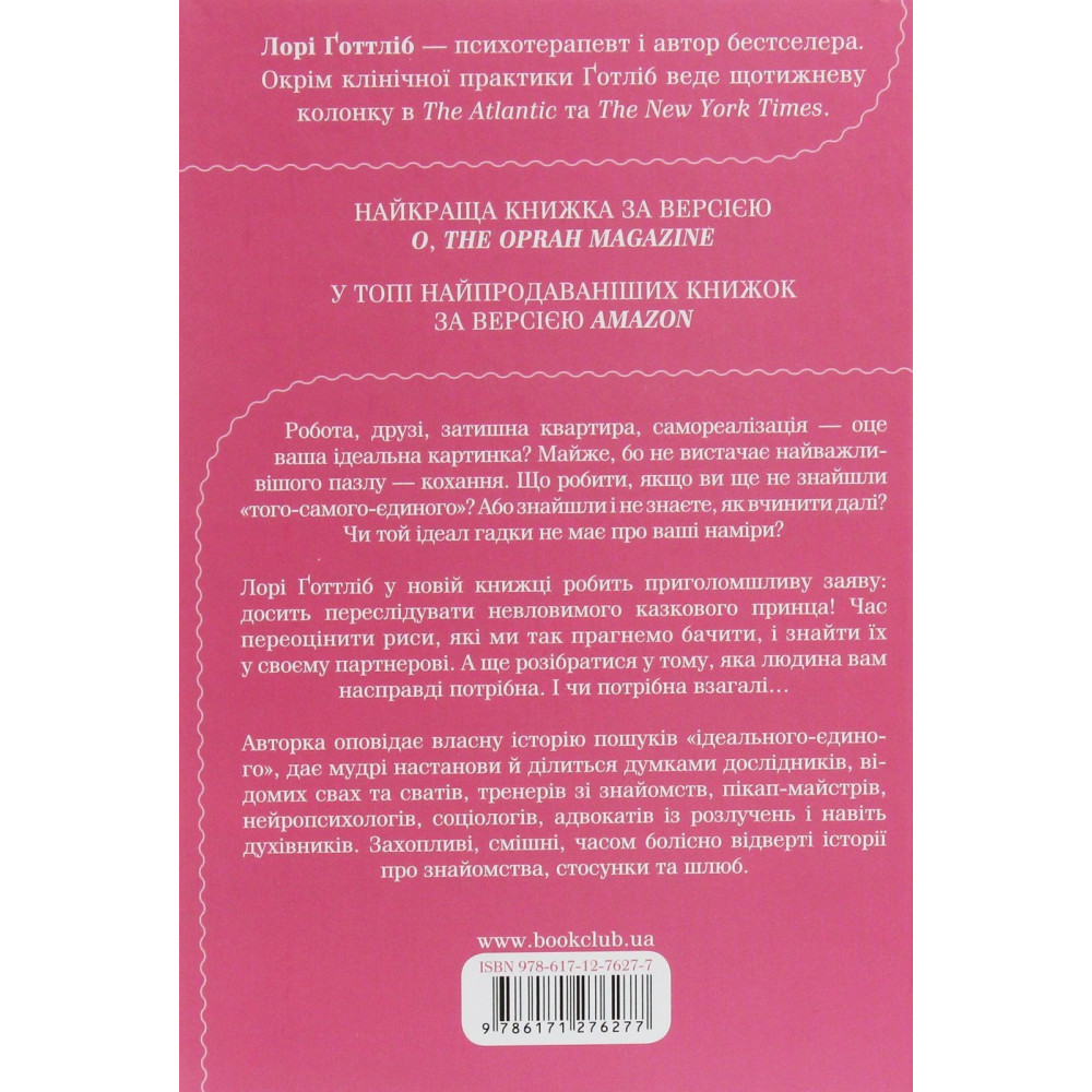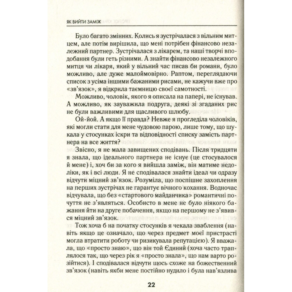 Лорі Ґоттліб у своїй новій книзі «Як вийти заміж. І чи варте воно того» робить шокуючу заяву: досить переслідувати невловимого чарівного принца! Час переоцінити риси, які ми так прагнемо бачити, і знайти їх у своєму партнерові. А ще розібратися у тому, яка людина вам насправді потрібна. І чи потрібна взагалі…