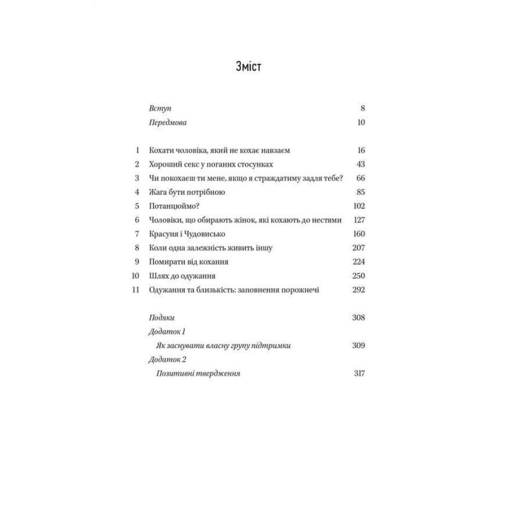 У книзі відверто говориться про аб’юз та причини любовної залежності. Авторка допомагає знайти приховані патерни внутрішнього конфлікту, звідки береться токсична установка «любити = страждати», та як із нею боротися.
