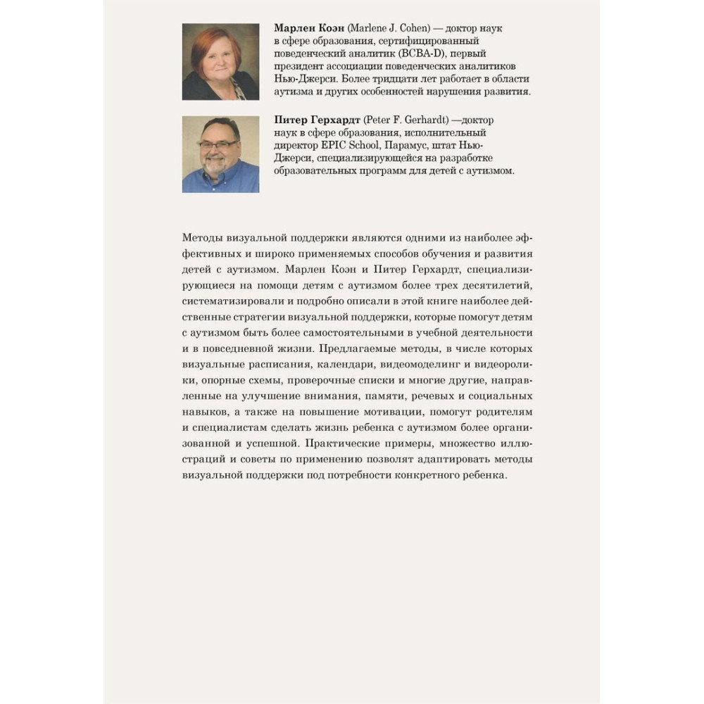 Методи візуальної підтримки є одними з найефективніших і найширше застосовуваних способів навчання та розвитку дітей з аутизмом. Марлен Коен і Пітер Герхардт, що спеціалізуються на допомозі дітям з аутизмом понад три десятиліття, систематизували й докладно описали в книзі «Визуальная поддержка. Система действенных методов для развития навыков самостоятельности у детей с аутизмом» найдієвіші стратегії візуальної підтримки, що допоможуть дітям з аутизмом бути самостійнішими в навчальній діяльності та в повсякденному житті.