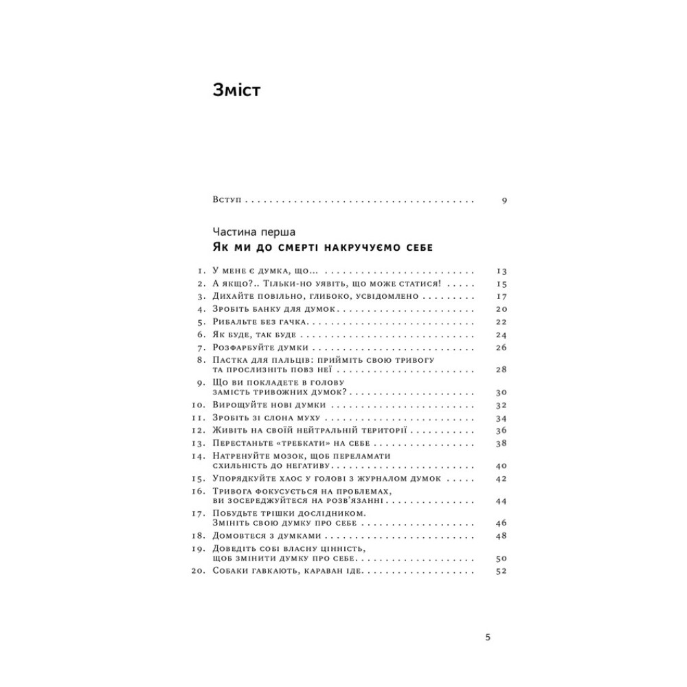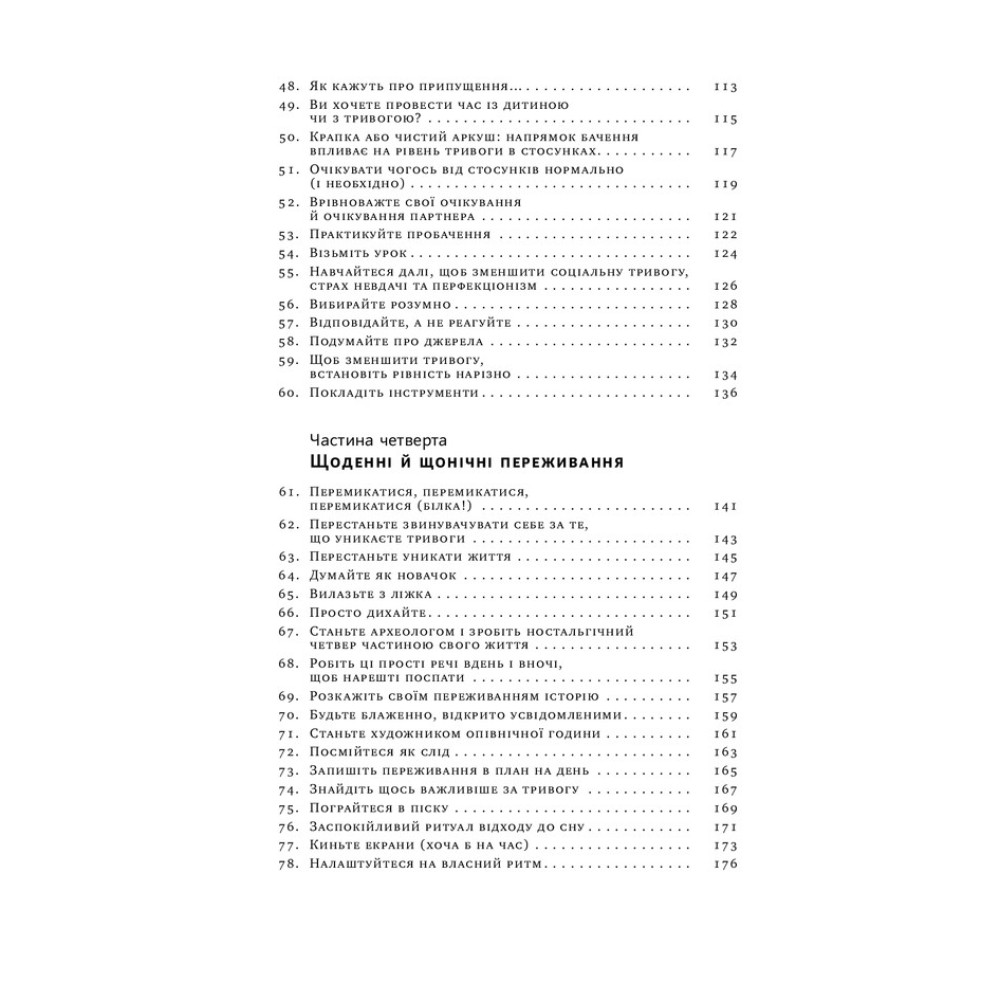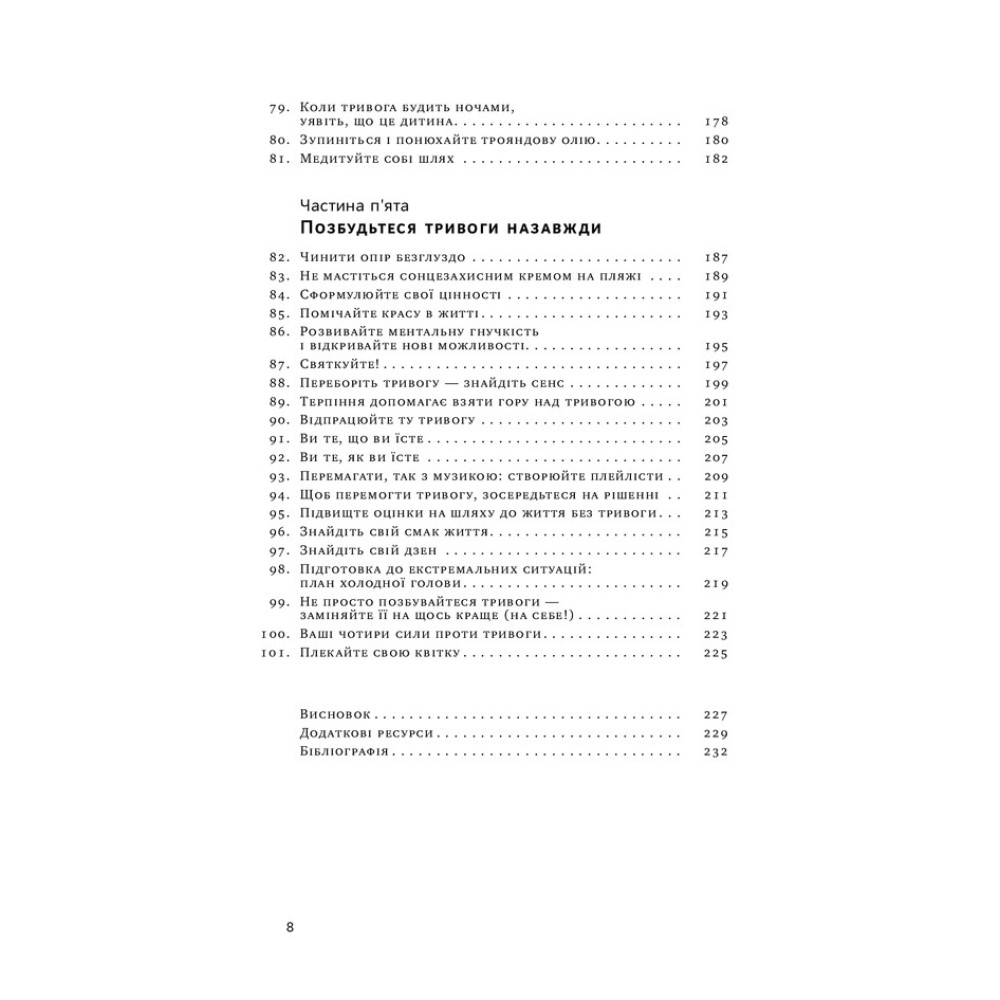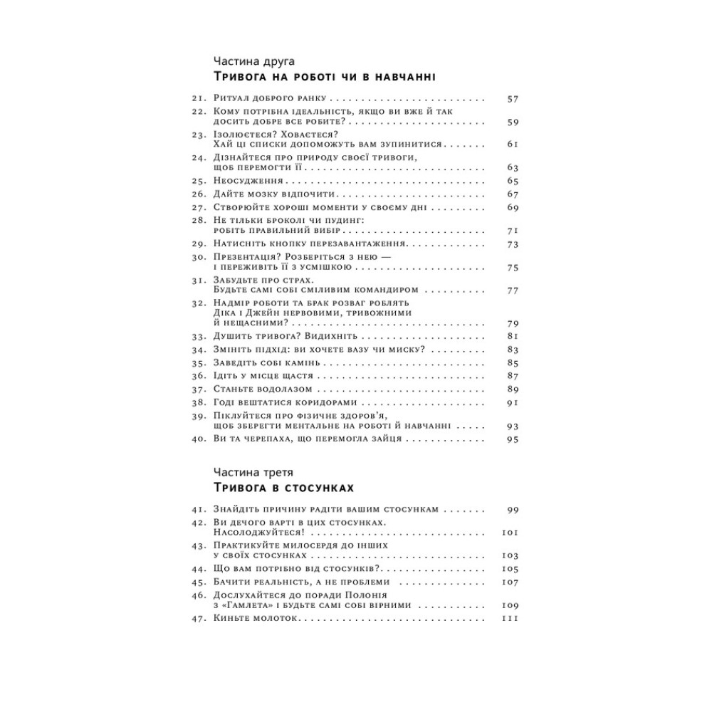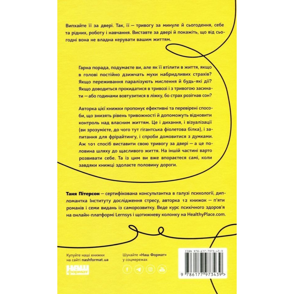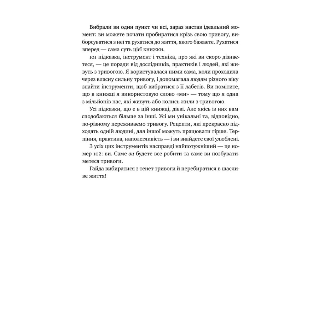 Таня Пітерсон пропонує у книжці «101 спосіб впоратися з тривогою, страхом і панічними атаками» ефективні та перевірені способи, що знизять рівень тривожності і допоможуть відновити контроль над власним життям. Це і дихання, і візуалізації, і запитання для фрірайтингу, і спроби домовитися з думками. Аж 101 спосіб виставити свою тривогу за двері — а це половина шляху до щасливого життя. На іншій половині варто розвивати себе. Та і з цим ви вже впораєтеся самі, коли завдяки книжці здолаєте першу частину дороги.