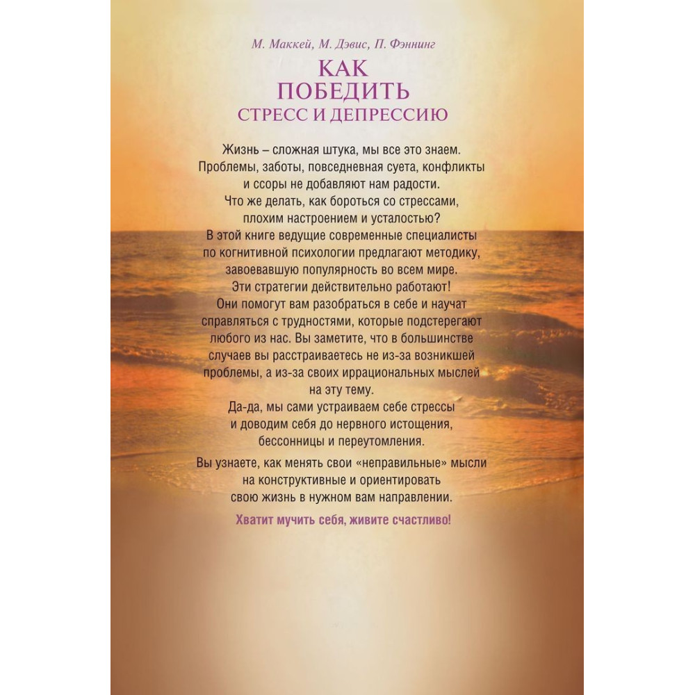 Спільна робота Метью Маккея, Марка Девіса й Патріка Феннінга «Как победить стресс и депрессию» запропонує методику, що завоювала популярність у всьому світі. Ці стратегії справді працюють. Вони допоможуть вам розібратися в собі й навчитися справлятися з труднощами, що підстерігають будь-кого з нас. Ви помітите, що в більшості випадків ви засмучуєтеся не через проблему, що виникла, а через свої ірраціональні думки на цю тему.