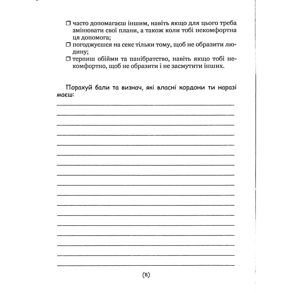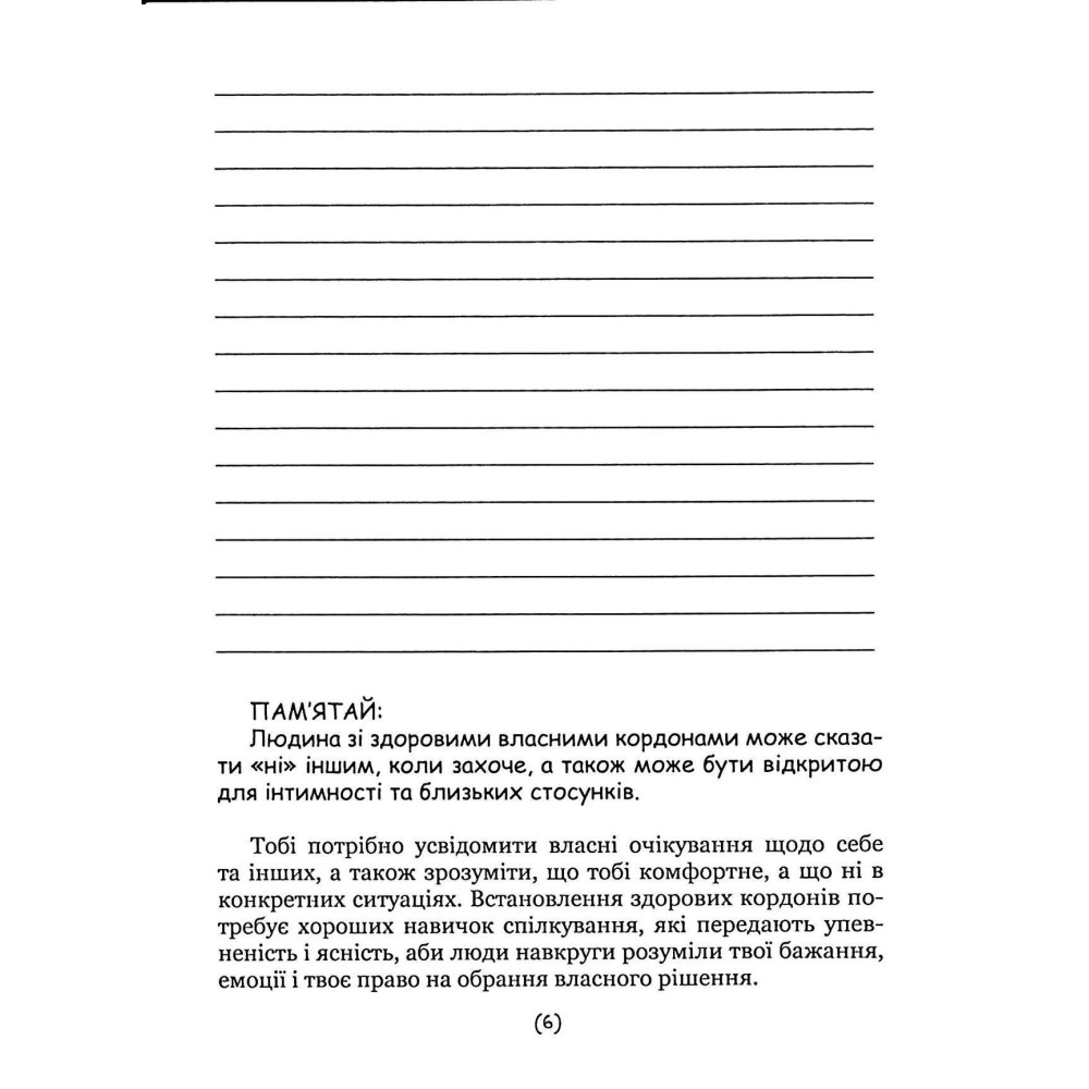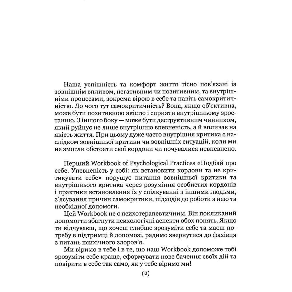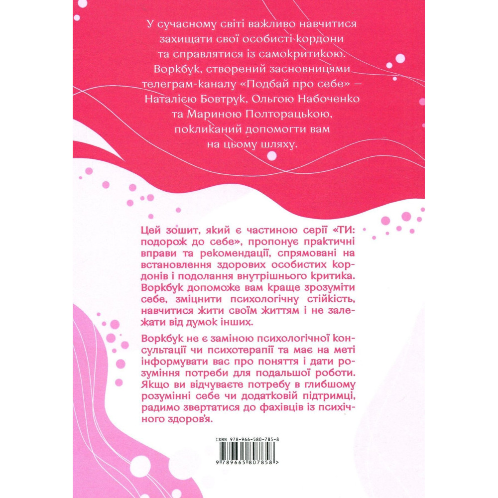 Робочий зошит «Подбай про себе. Упевненість у собі: як встановити кордони та не критикувати себе», який є частиною серії «ТИ: подорож до себе» від Наталії Бовтрук, Ольги Набоченко та Марини Полторацької, пропонує практичні вправи та рекомендації, спрямовані на встановлення здорових особистих кордонів і подолання внутрішнього критика. Воркбук допоможе вам краще зрозуміти себе, зміцнити психологічну стійкість, навчитися жити своїм життям і не залежати від думок інших.
