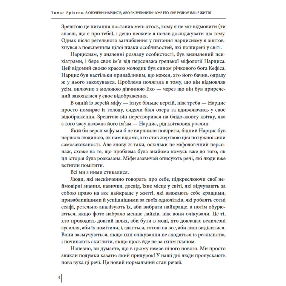 Автор міжнародних бестселерів Томас Еріксон ділиться своїм секретом поводження з нарцисами. Якщо ви втомилися від їхнього постійного вимагання уваги, абсолютної впевненості у своїй правоті, потреби контролювати всіх і все навколо, його книга «В оточенні нарцисів, або Як зупинити чуже его, яке руйнує ваше життя» допоможе зберегти здоровий глузд.