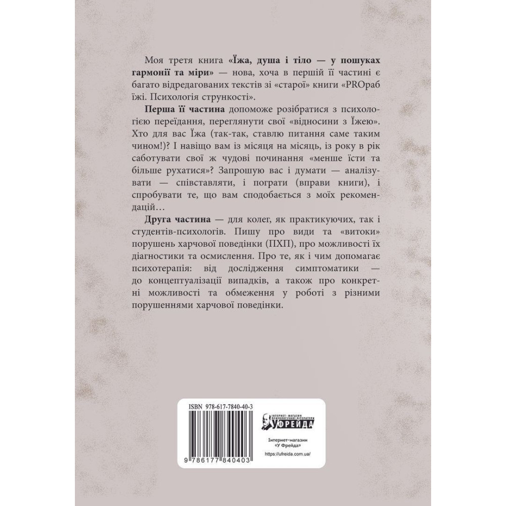 Книга «Їжа, душа і тіло у пошуках гармонії та міри» допоможе розібратися з психологією переїдання, з тим як кожного понеділка ми обіцяємо менше їсти і більше рухатися і знову заїдаємо тяжкий день шматочком шоколаду.
