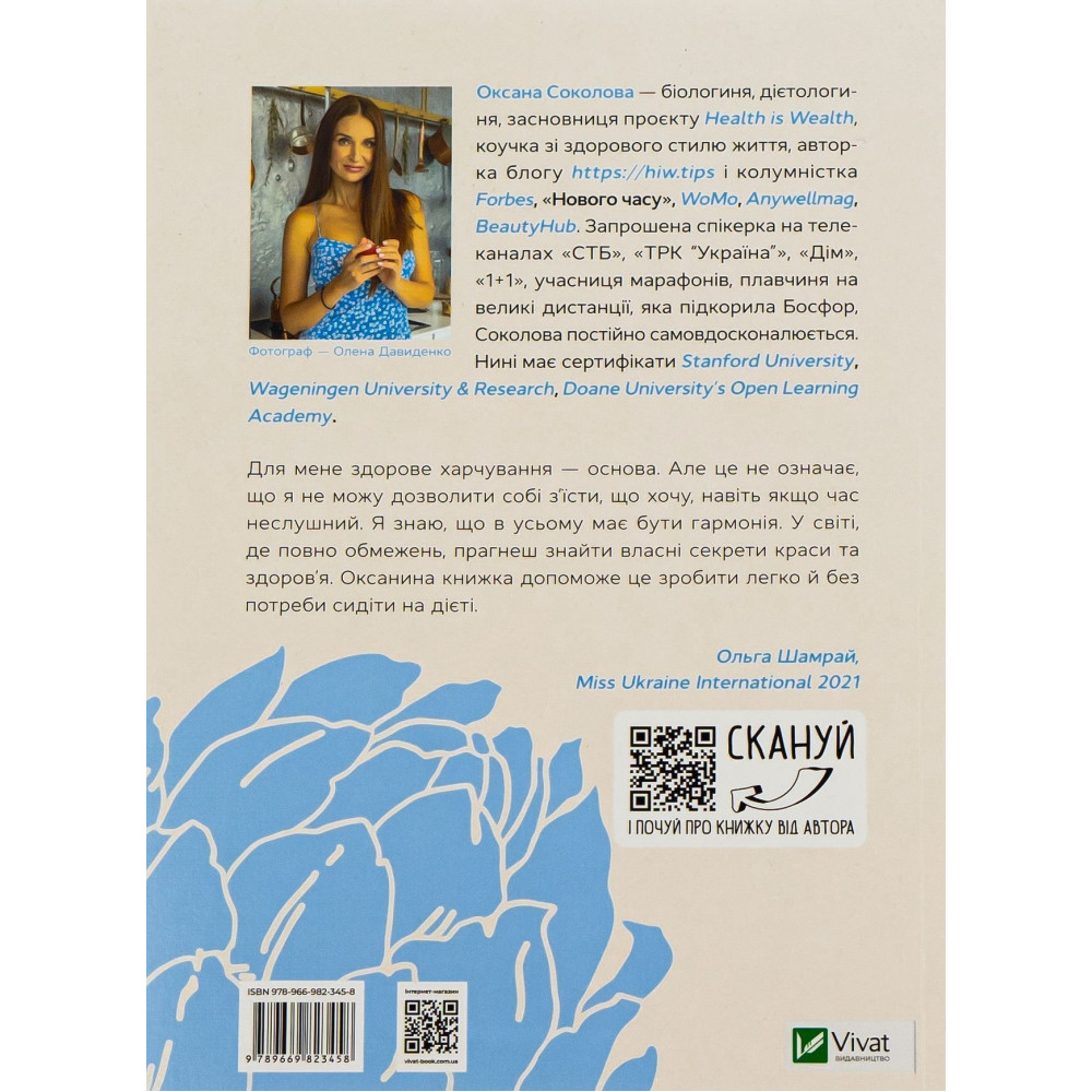 Тонкощі, якими залюбки ділиться експертка з біохакінгу й антиейджингу Оксана Соколова у книзі «Здоровий раціон для кращої версії себе», допоможуть вам стати кращою версією себе, красивою, здоровою, енергійною.
