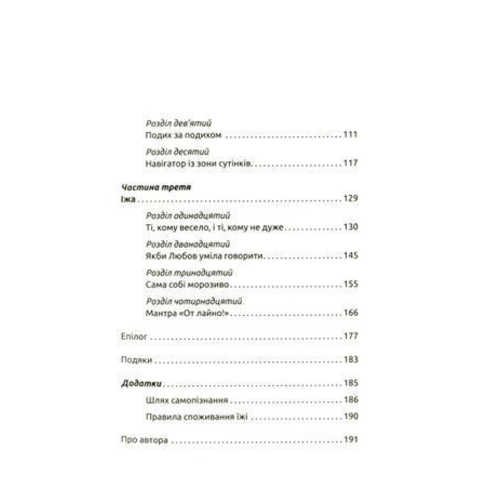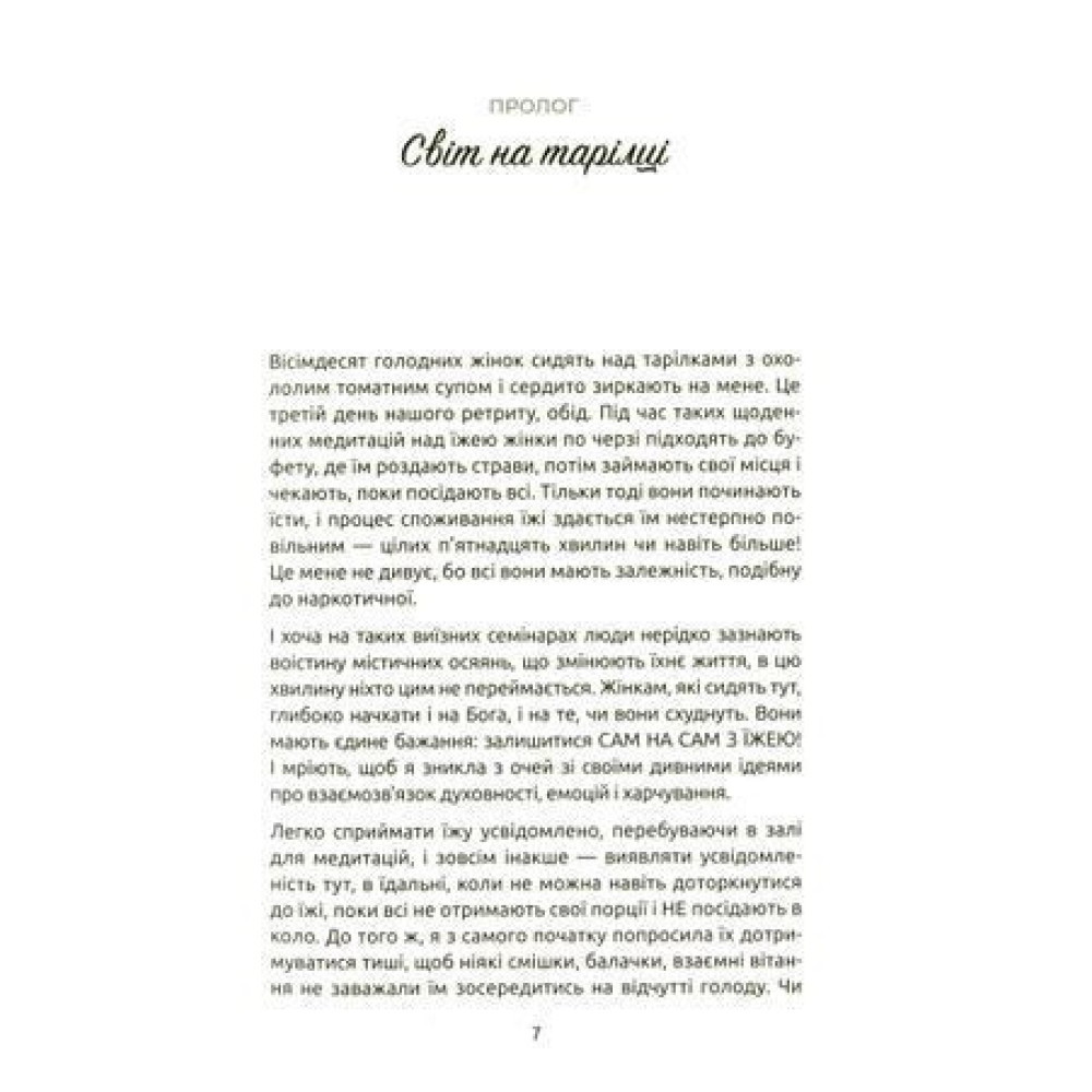 Замість того, щоб засуджувати якісь несамовиті вчинки, Джанін запевняє, що всі наші думки і дії мають сенс, і що змінити своє ставлення до їжі, до свого тіла і загалом до всього можна лише в один спосіб: насмілитися бути відкритими, допитливими і добрими до себе і до світу — та навчитися їсти. Книжка надасть сім правил життя, які допоможуть і будуть корисними.
