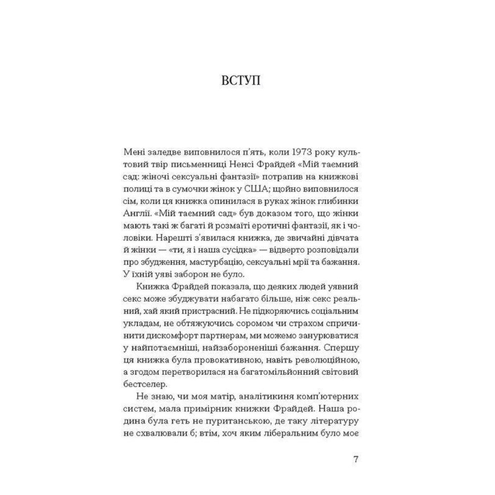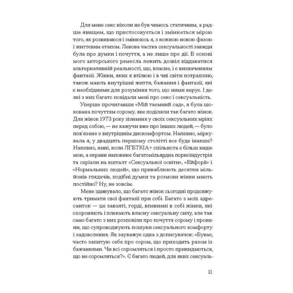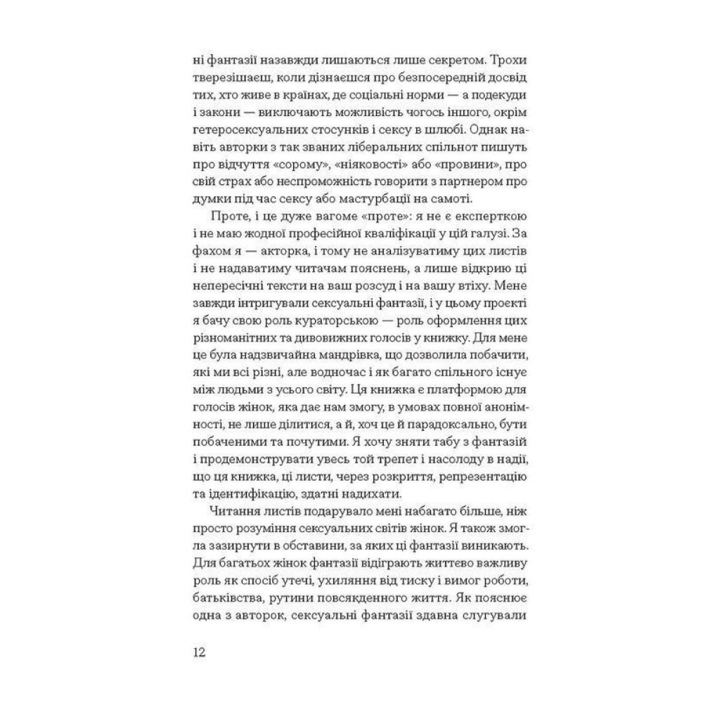 Андерсон виступає тут не як оповідачка, а як кураторка жіночого досвіду — вона уважно впорядковує історії, об’єднуючи їх у тематичні розділи: ніжність, влада, спостереження, втеча, близькість, табу. Кожна фантазія — короткий уривок зі щоденника чужої душі, де поруч із пристрастю звучить самотність, страх, потреба бути поміченою чи зрозумілою.