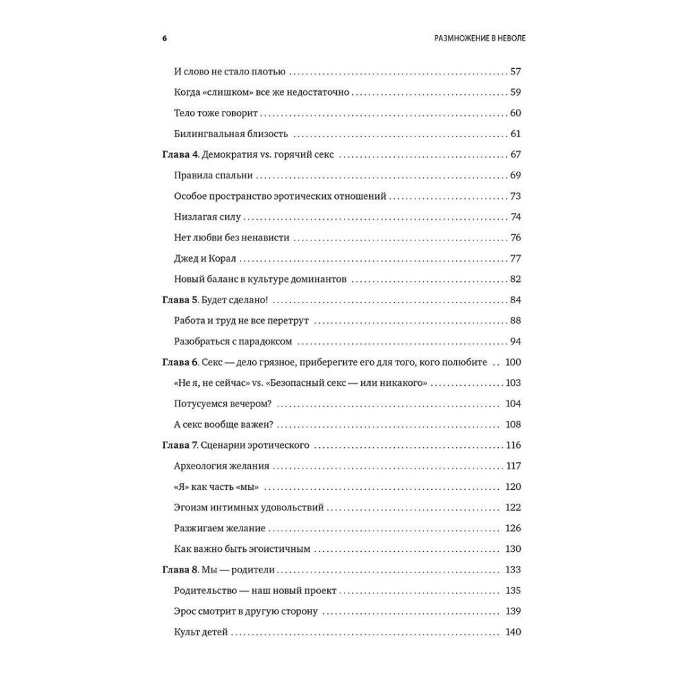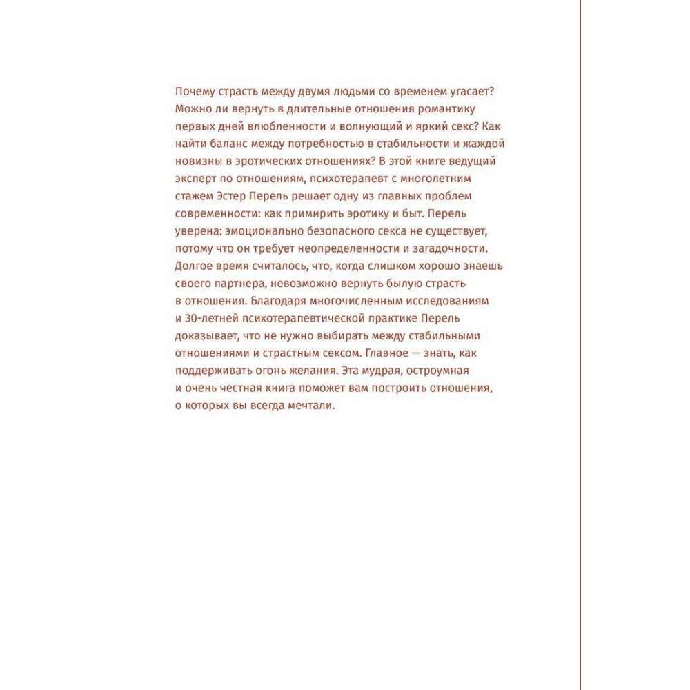 Провідна експертка зі стосунків Естер Перель досліджує у книзі «Размножение в неволе: Как примирить эротику и быт» зв'язок тривалих стосунків і бажання та розповідає, як можна повернути пристрасть. Використовуючи безліч прикладів і досліджень, Естер доводить, що хвилюючий, яскравий і романтичний секс можливий у довгих стосунках. Ця мудра, дотепна і дуже чесна книжка змінить ваші стосунки і відродить бажання, притаманне першим дням закоханості.