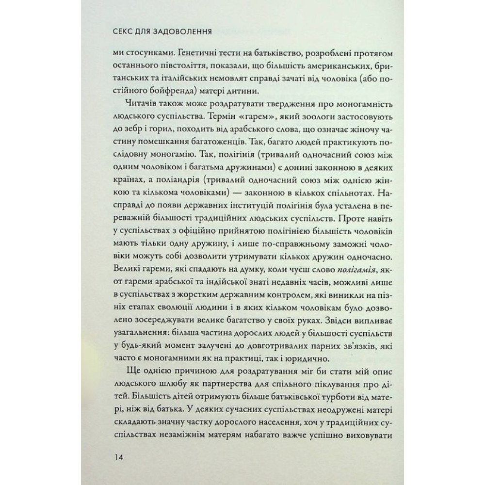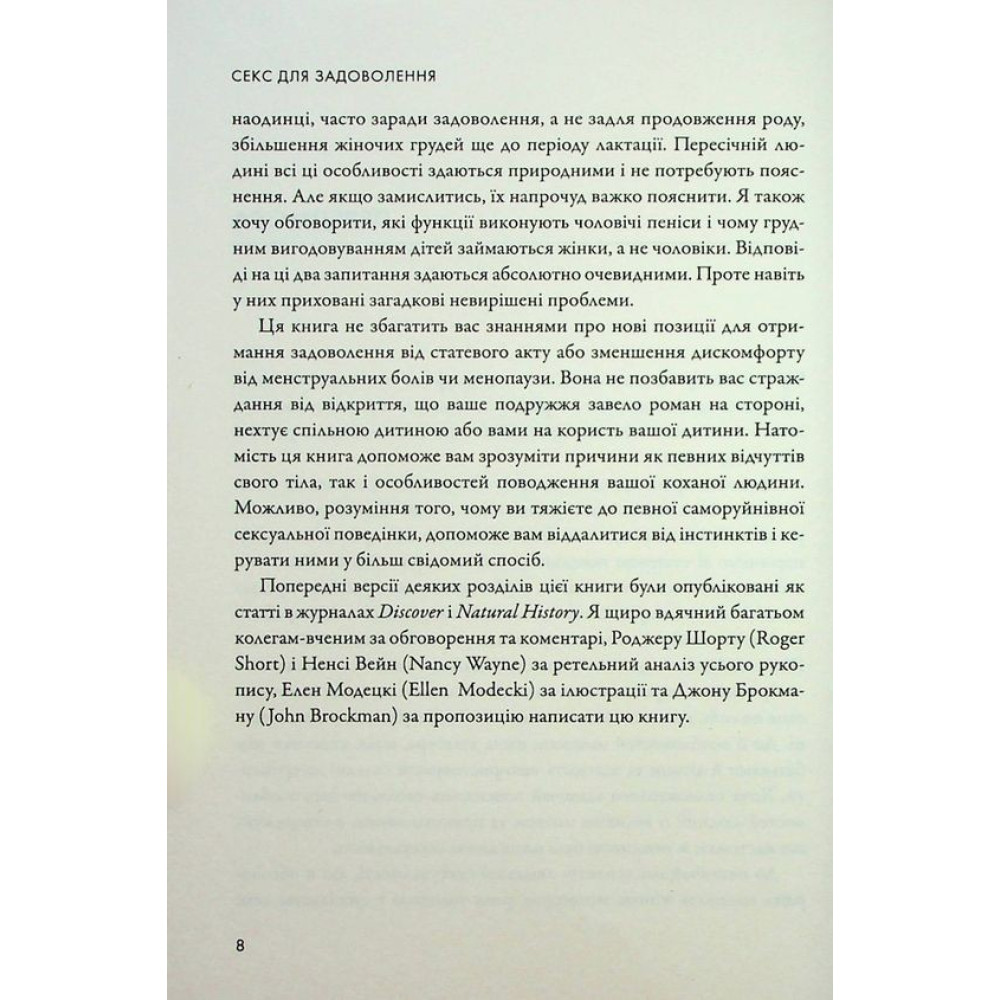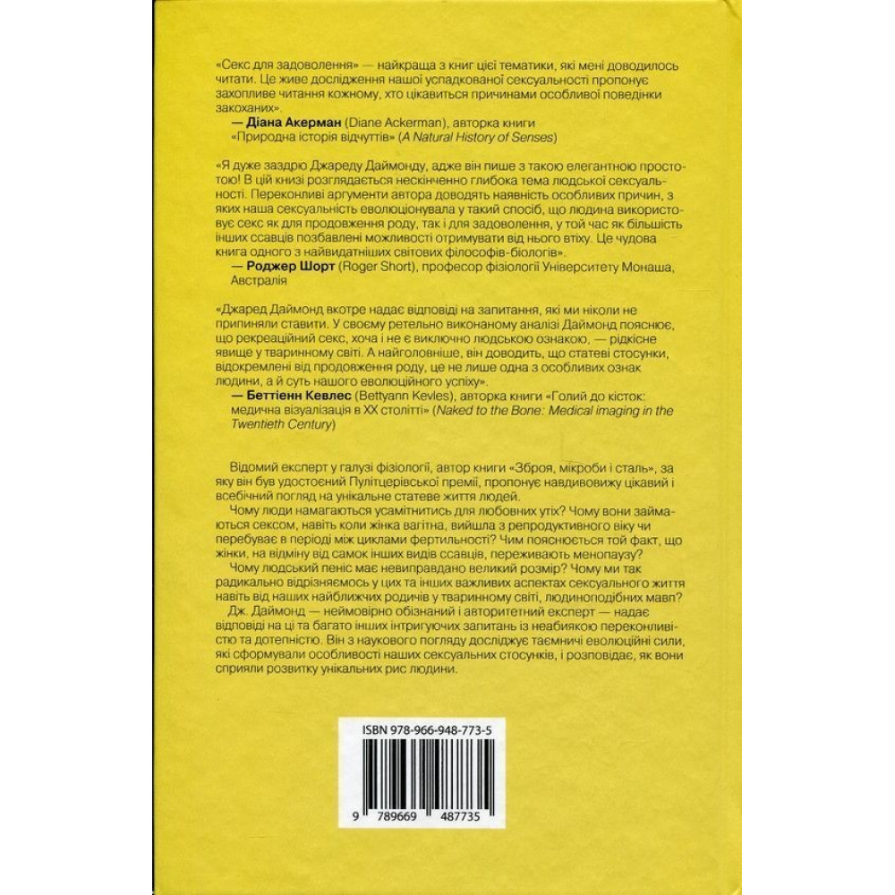 Ніхто не відповість на всі ці запитання краще за Джареда Даймонда — автора книги «Секс для задоволення. Еволюція сексуальності людини» та відомого експерта в галузі фізіології й еволюційної біології, творця широковідомих науково-популярних праць, удостоєного низки престижних нагород. Він пояснює, як на наших предків діяли сили еволюції, сприяючи розвитку унікальних особливостей їхнього статевого життя.