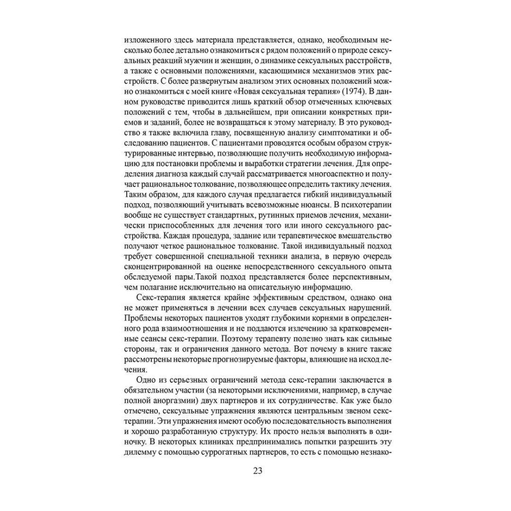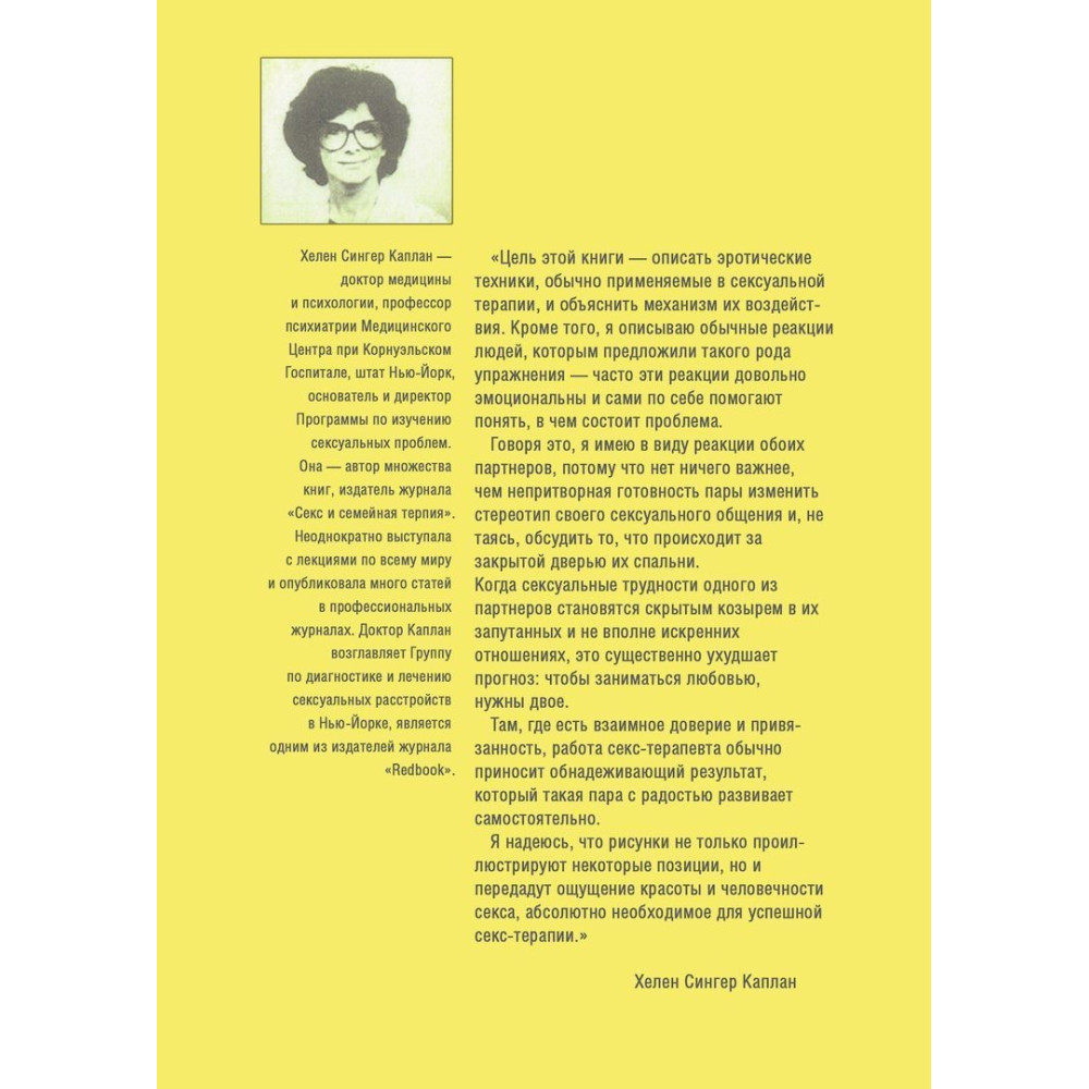 На книжковому ринку повно літератури «про це», але такої ще не було. По-перше, книга «Сексуальная терапия. Иллюстрированное руководство» написана професіоналкою — Гелен Сінгер Каплан — у якої практика мала сотні випадків успішної допомоги тим, хто страждає від сексуальних розладів. Можна сказати по-іншому: написана розумною і тактовною жінкою-лікарем, яка серйозно і з розумінням ставиться до людей, у яких не виходить займатися коханням так, як їм хотілося б.