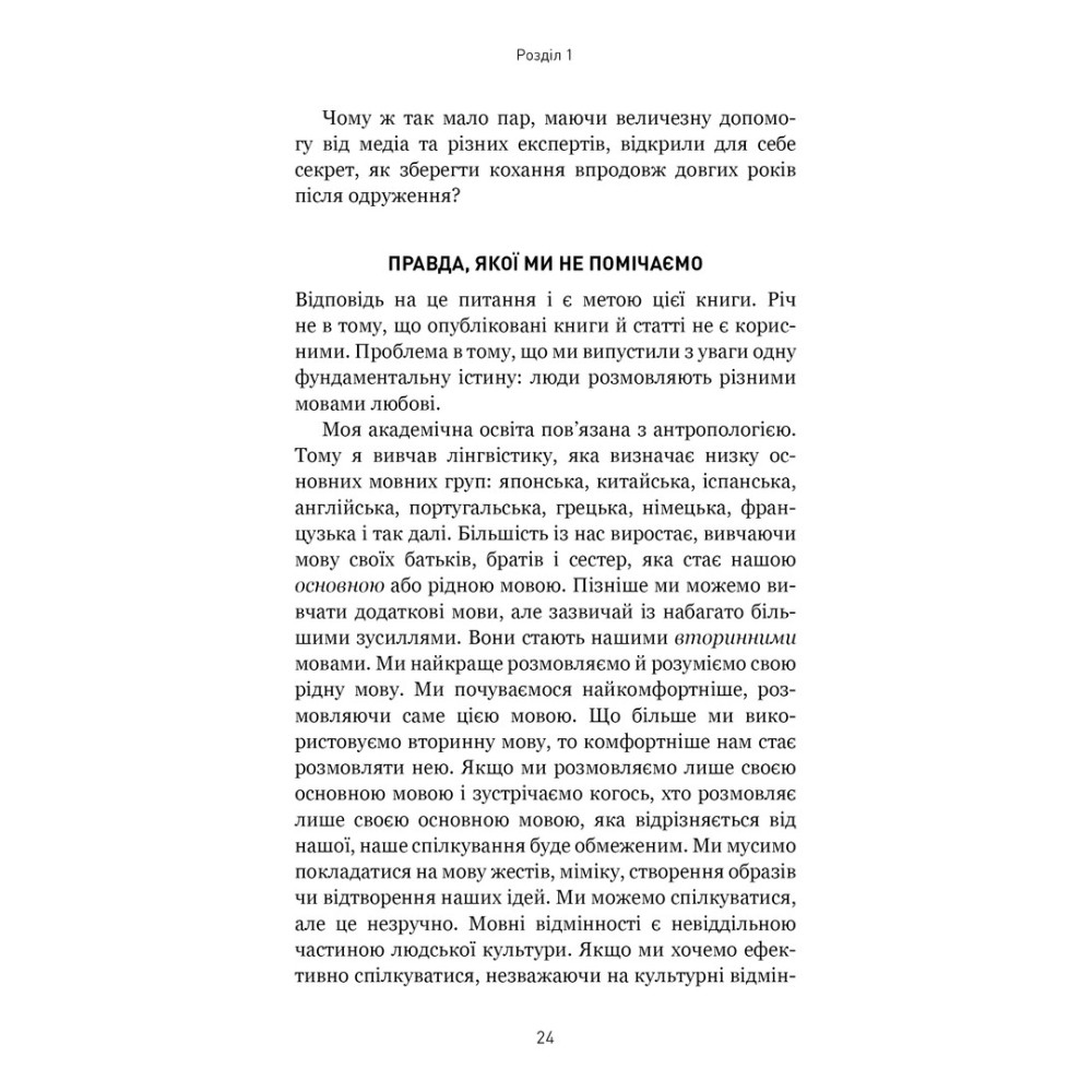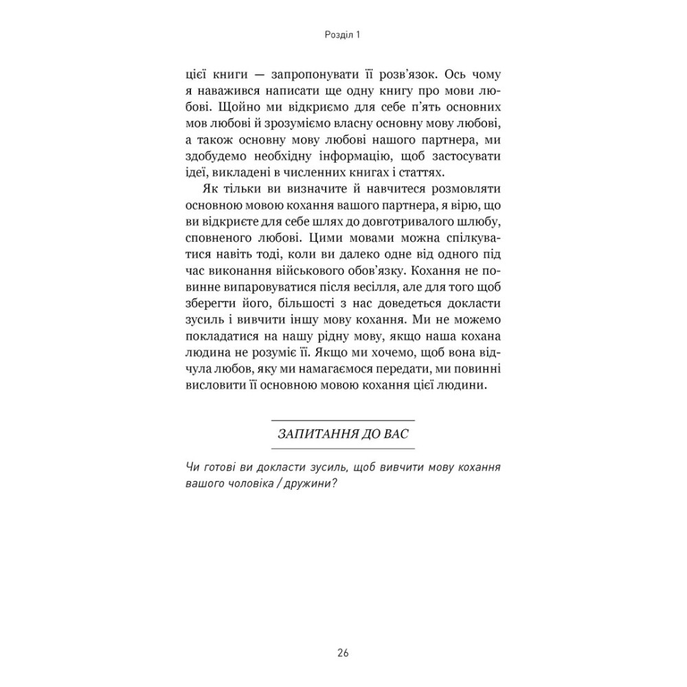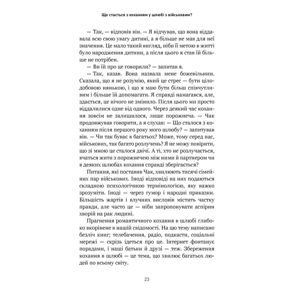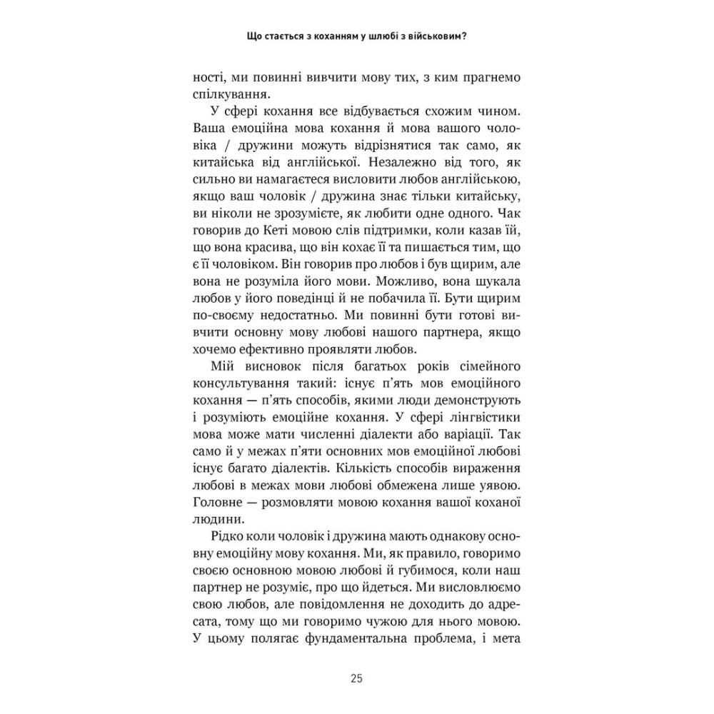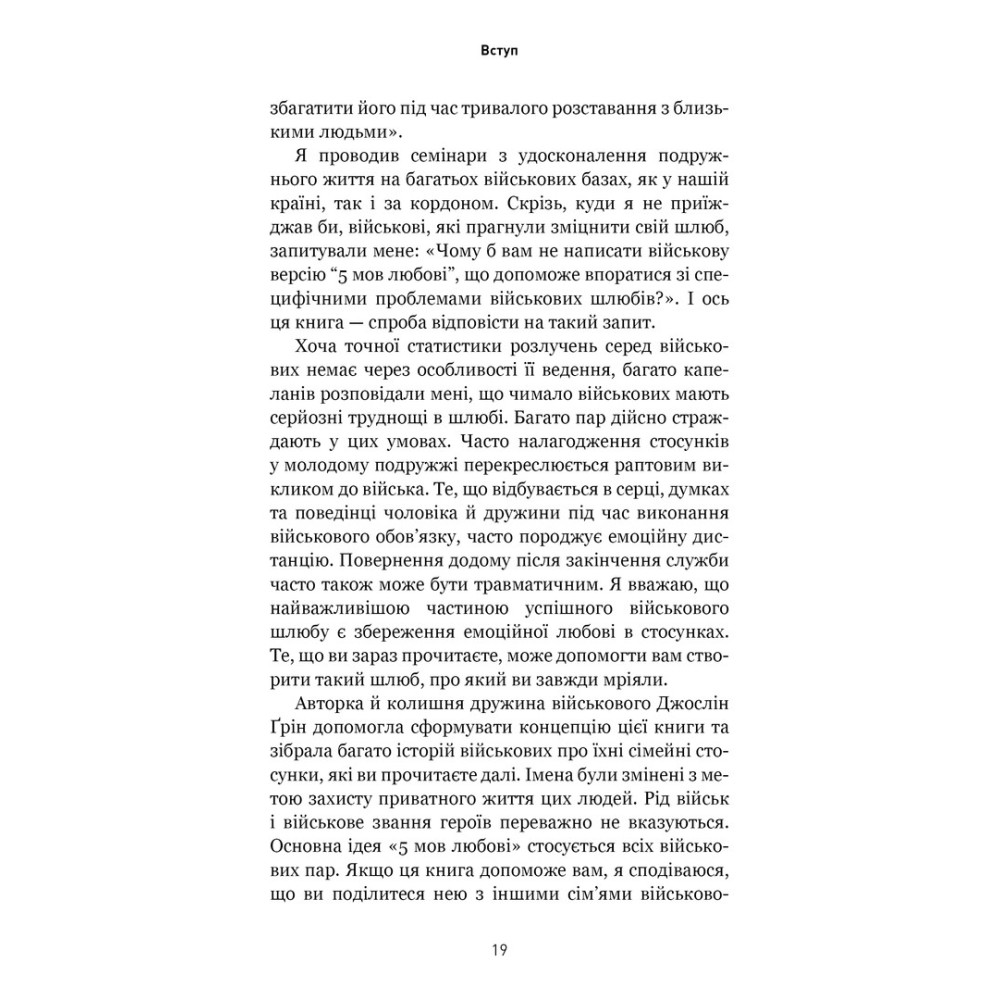 Книга «5 мов любові: військове видання. Секрети стійкості кохання» від Ґері Чепмена та Джослін Ґрін розійшлася світом тиражами у понад 20 мільйонів примірників. Її секрет полягає в тому, що Ґері Чепмен сформулював основні види любові, яких потребують різні люди, дав інструмент для визначення саме вашої мови любові й показав, як скористатися цією інформацією, щоб зміцнити, поліпшити або відновити стосунки з партнером.