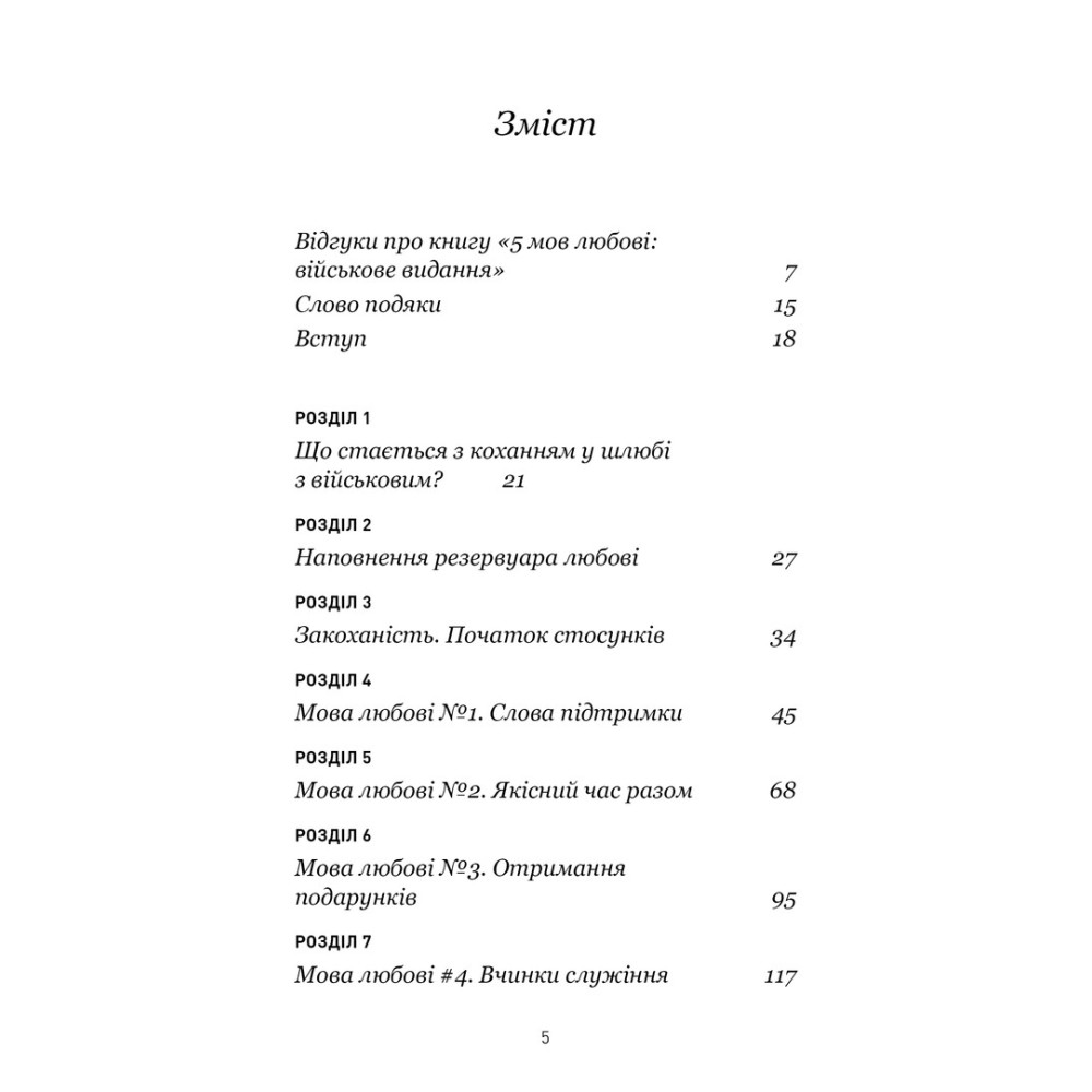 Теорію про 5 мов любові: слова підтримки, якісний час разом, отримання подарунків, вчинки служіння й фізичний контакт — Ґері Чепмен разом із дружиною військового Джослін Ґрін адаптували для пар, які змушені жити в тривалій розлуці й тривогах через те, що є родинами військовослужбовців. Для українців нині ця тема стає дедалі важливішою, тож військове видання бестселера «5 мов любові» стане в пригоді тисячам наших співвітчизників.
