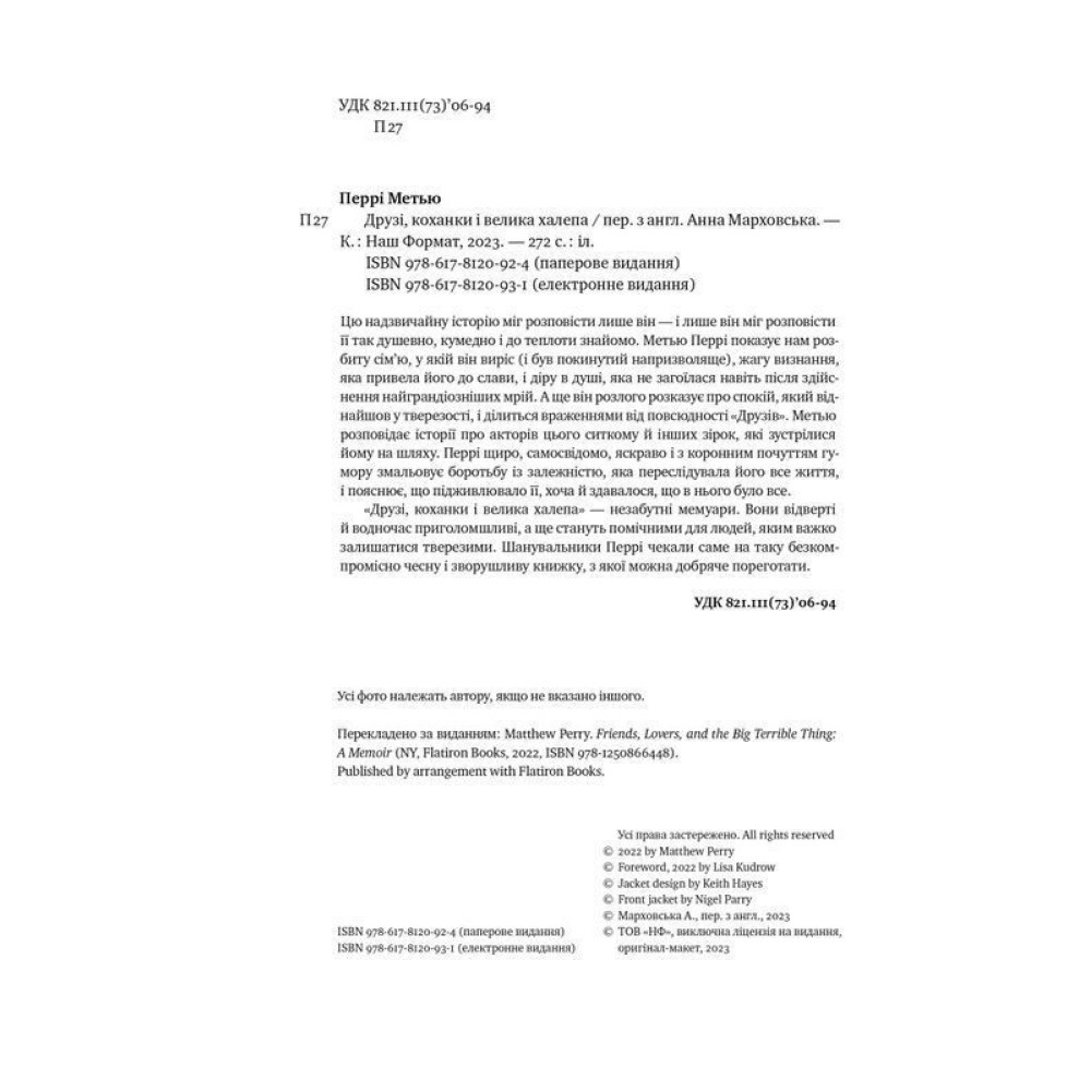 «Друзі, коханки і велика халепа» — дотепні й відверті мемуари від зірки «Друзів» Метью Перрі про залаштунки мегапопулярного ситкому і своєї боротьби із залежністю.