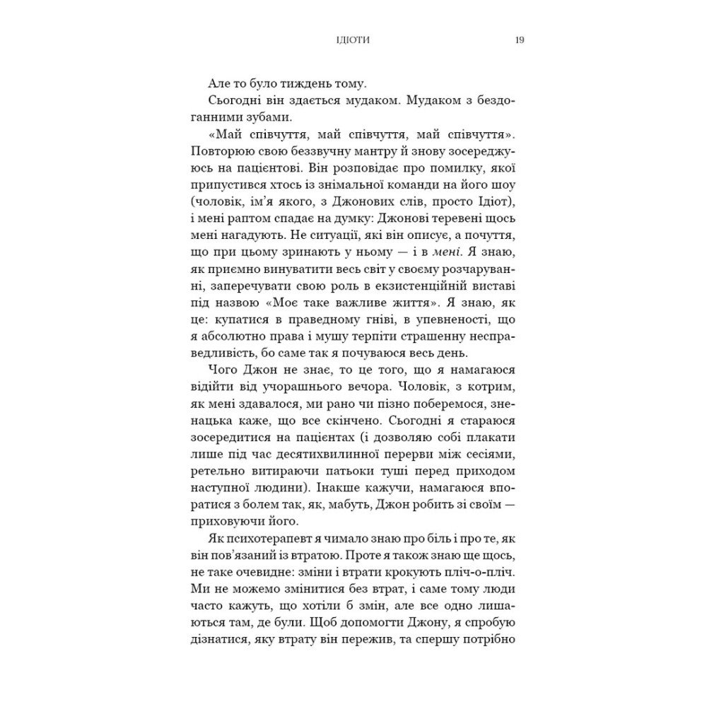 По-перше, у щирості й відвертості. Лорі Ґоттліб, досить успішну психотерапевтку, покидає бойфренд, бо не хоче жити разом із її дитиною. Не в змозі самотужки впоратися з цією ситуацією, Лорі сама стає пацієнткою психотерапевта Венделла — їй просто дуже треба з кимось поговорити про своє життя. І вона не приховує ані своєї слабкості, ані сліз, ані незмоги впоратися із втратою самотужки, попри свій досвід терапевта. Вона щиро зізнається собі: мені треба допомога. Саме це радить і читачам.