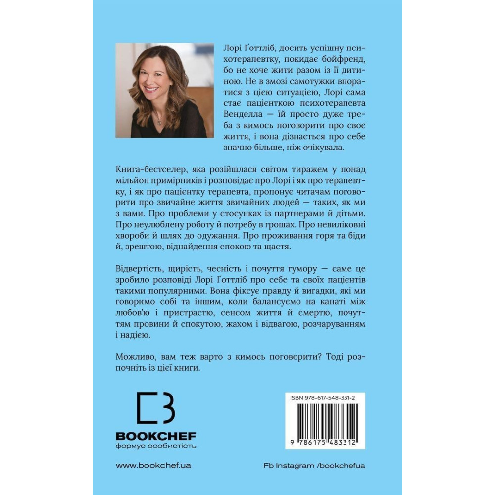 Книга «Можливо, вам варто з кимось поговорити. Відверті нотатки психотерапевта» від Лорі Ґоттліб уже продана тиражами у понад мільйон примірників по всьому світу. Триває робота з розробки серіалу за нею — головну роль має зіграти Єва Лонгорія. Книгу читають і психотерапевти, і їхні клієнти — і кожен знаходить для себе підтримку, підказку, розраду й просто хороший настрій.