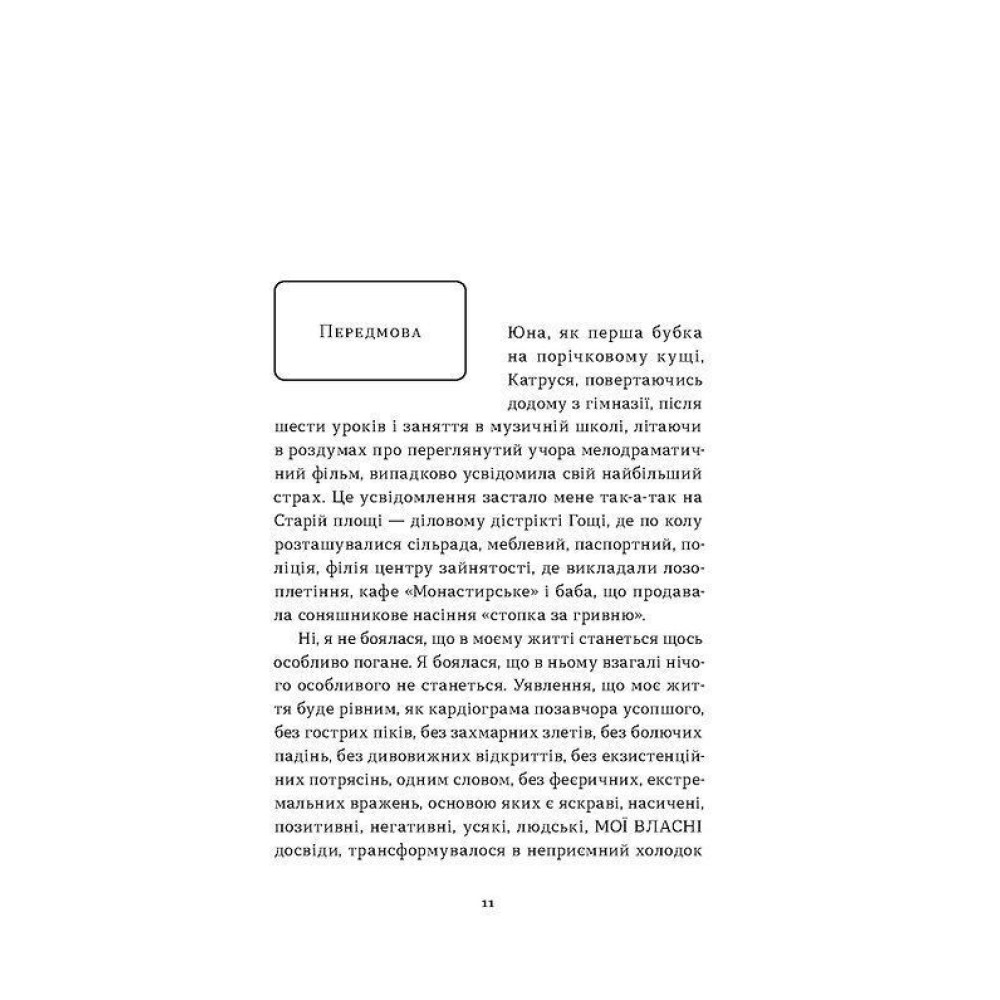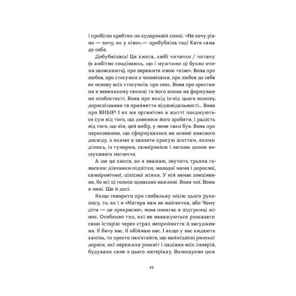 Ця історія про любов, секс і стосунки з чоловіками, вона про зростання у невеликому селищі та дорослішання. А ще ця історія про вибір та любов до себе як основу всіх стосунків. Від дівчинки-підлітки до дорослої жінки — авторка ділиться своїми поглядами з гумором, самоіронією та легкою дозою вишуканого матюччя.
