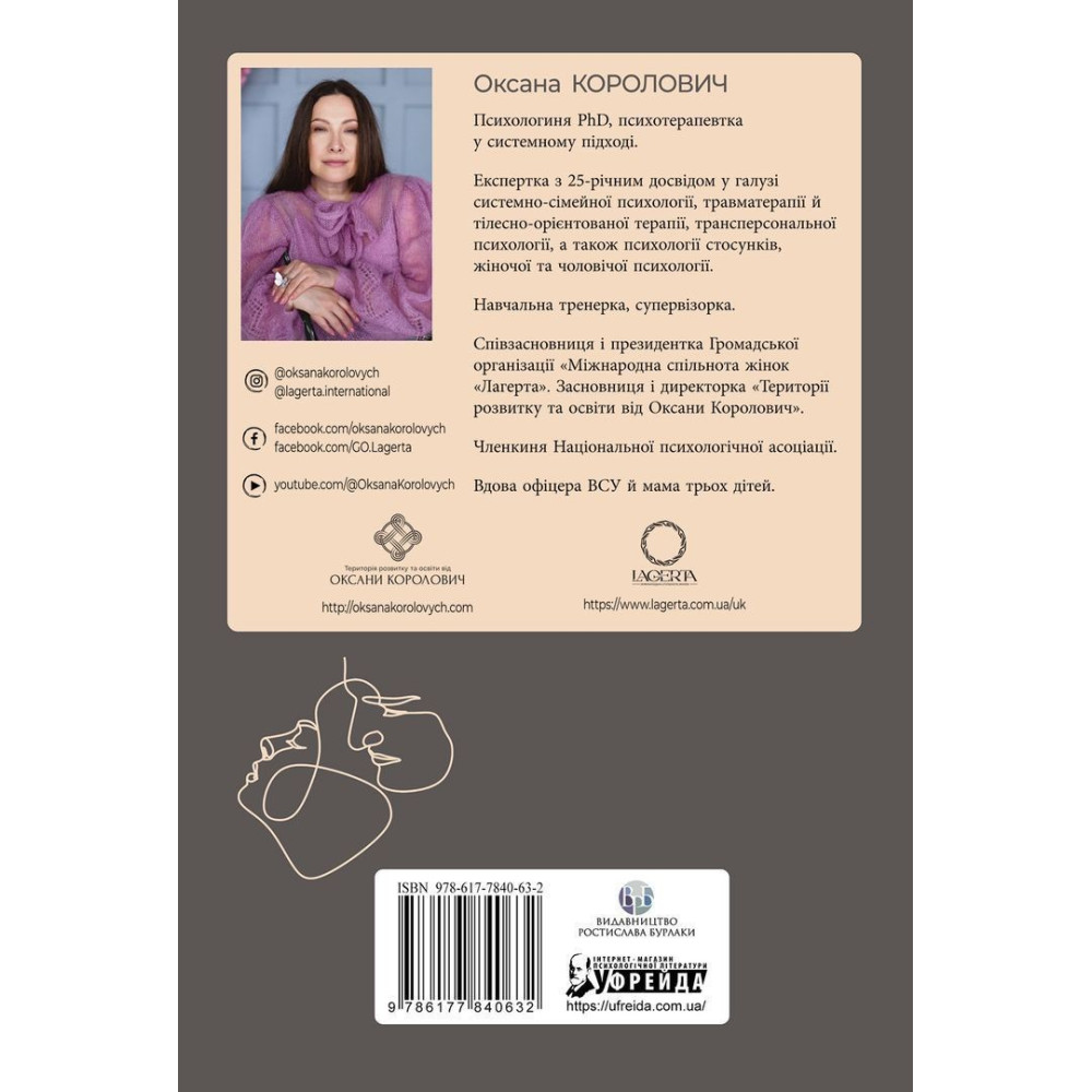 Оксана Королович — психологиня PhD, психотерапевтка у системному підході, є навчальною тренеркою й супервізоркою. Має 25 років досвіду у галузях системно-сімейної психології, травматерапії й тілесно-орієнтованої терапії, трансперсональної психології, а також психології стосунків, крім того, жіночої й чоловічої психології. Заснувала заклад «Територія розвитку та освіти від Оксани Королович», є співзасновницею й президенткою Громадської організації «Міжнародна спільнота жінок "Лагерта"». Окрім того, вдова офіцера ЗСУ й мати трьох діточок, є членкинею Національної психологічної асоціації.