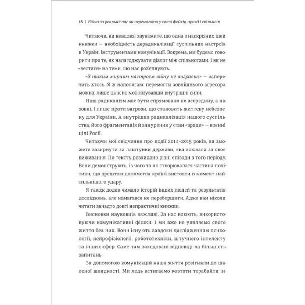 Орієнтуючись на приклади з Украіїни, інших краіїн та досвід компаній, автор проаналізував, як відбувається війна за реальність та виокремив п’ять правил, які допоможуть у ній перемогти. Основним поштовхом до написання книжки була анексія Криму та початок збройної агресії зі сторони Росії, адже брехня та маніпуляції, які поширюються за допомогою інтернету стали невід’ємною частиною цієї війни. Й українське суспільство виявилося не готовим захищати свій інформаційний простір.