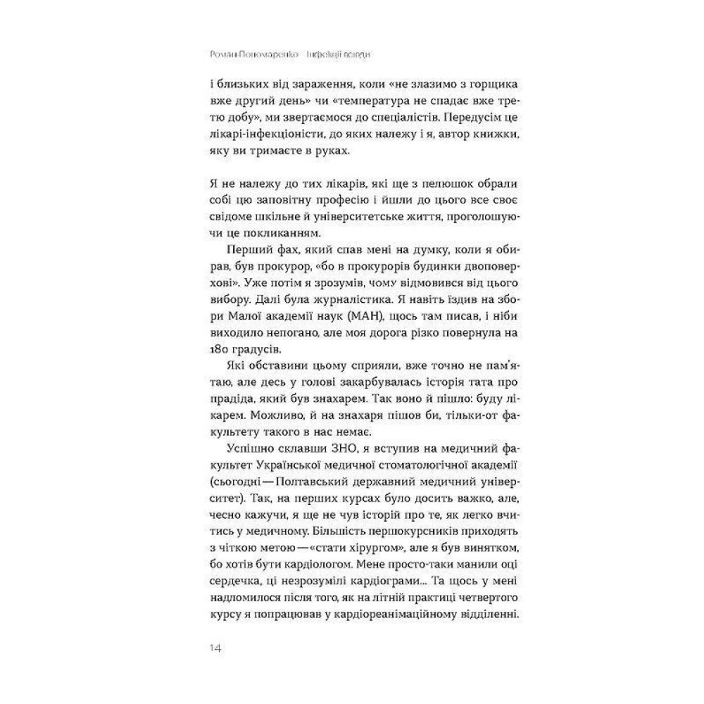 Лікар-інфекціоніст Роман Пономаренко у своїй книжці «Інфекції всюди. Застуда, герпес та інші сусіди людства» розповідає про найпоширеніші інфекції, їхні прояви й алгоритми дій у разі діагностування відповідної хвороби. Від ГРВІ, грипу та герпесу до гепатитів, ВІЛу й навіть холери.