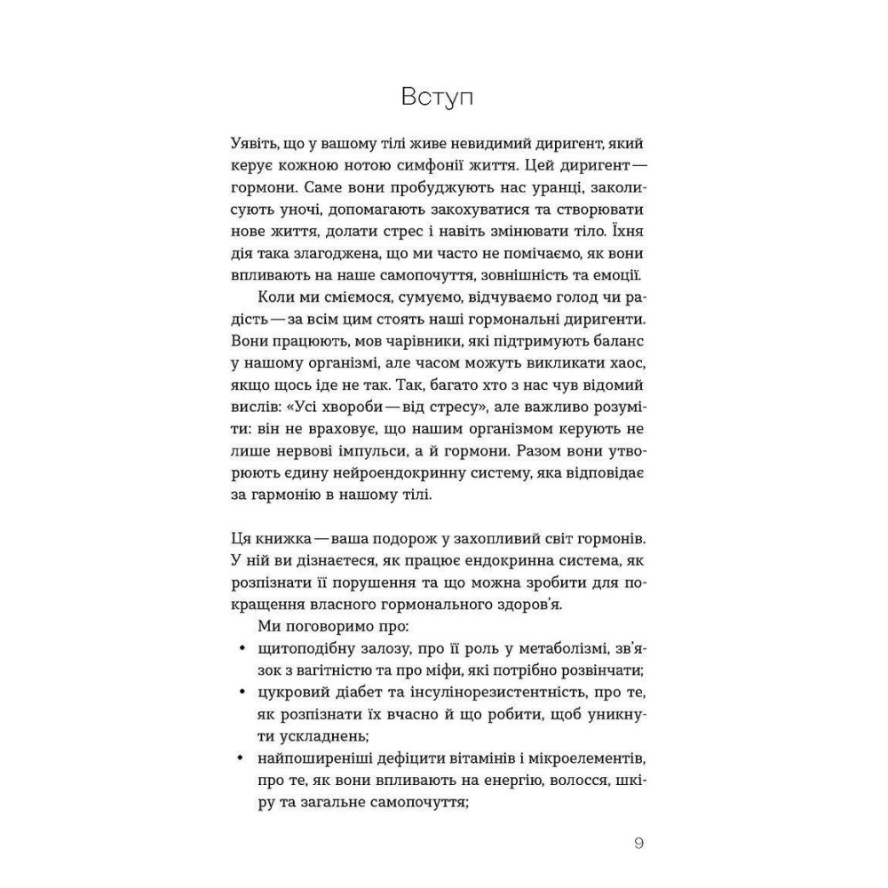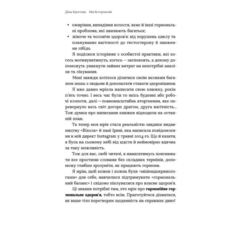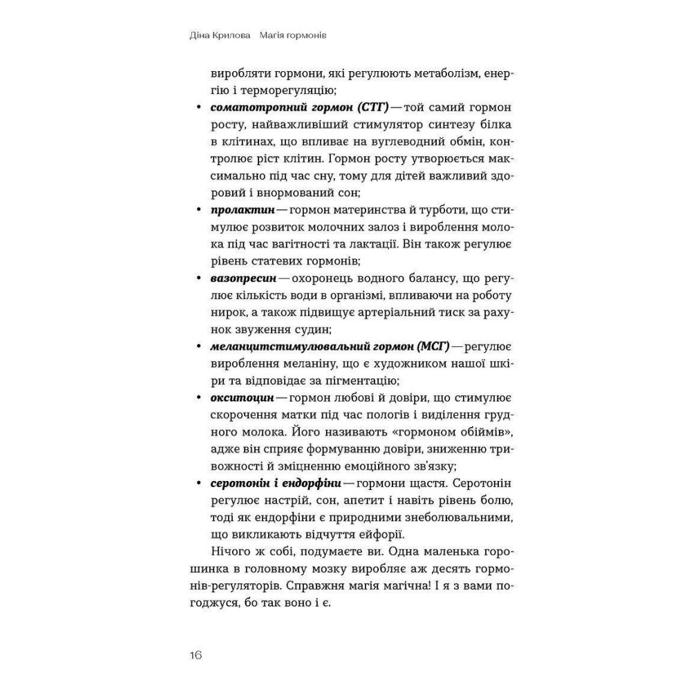 Лікарка-ендокринологиня Діна Крилова у своїй книжці «Магія гормонів. Невидимий диригент вашого життя» пояснить, як працює наша ендокринна система і навіщо нам щитоподібна залоза, як розпізнати переддіабет та чи буває «гормональний дисбаланс», і власне розкаже, на які аналізи й показники варто звертати увагу.