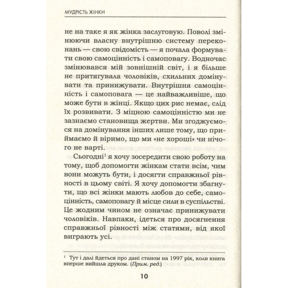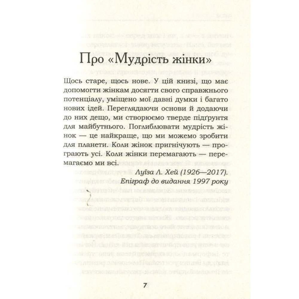 Луїза Хей, авторка книги «Мудрість жінки. Не змінюй інших, змінюй себе» впевнена, що жінки надто довго були повністю підвладні примхам і системам світогляду чоловіків. Їм розповідали, що, коли та як вони можуть і мають робити. Але світ змінився. І настав час жінкам подолати бар’єри самообмеження. У своїй теплій та відвертій манері авторка демонструє, як жінки будь-якого статусу та віку можуть зробити своє життя мегапродуктивним, реалізувати таланти та розширити можливості. Удосконалити своє життя у всіх царинах: самоповаги і любові, взаємин із батьками й дітьми, багатства та кар’єри.