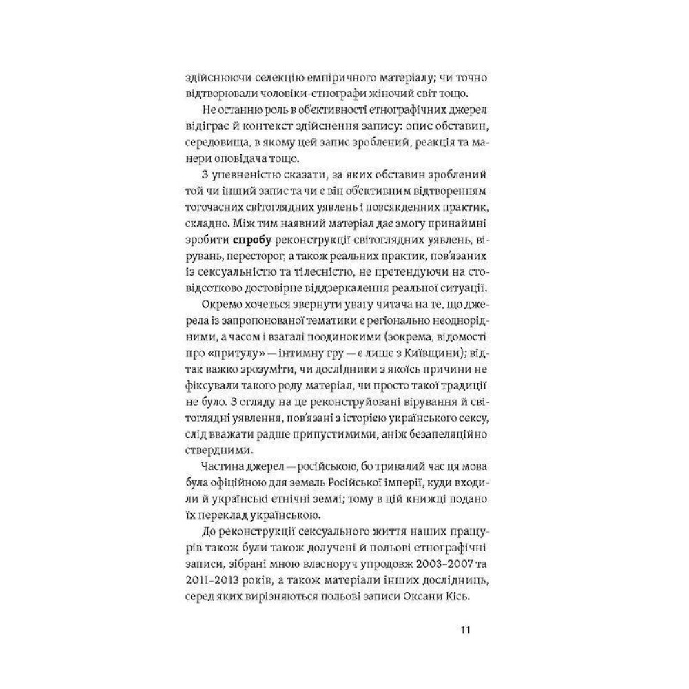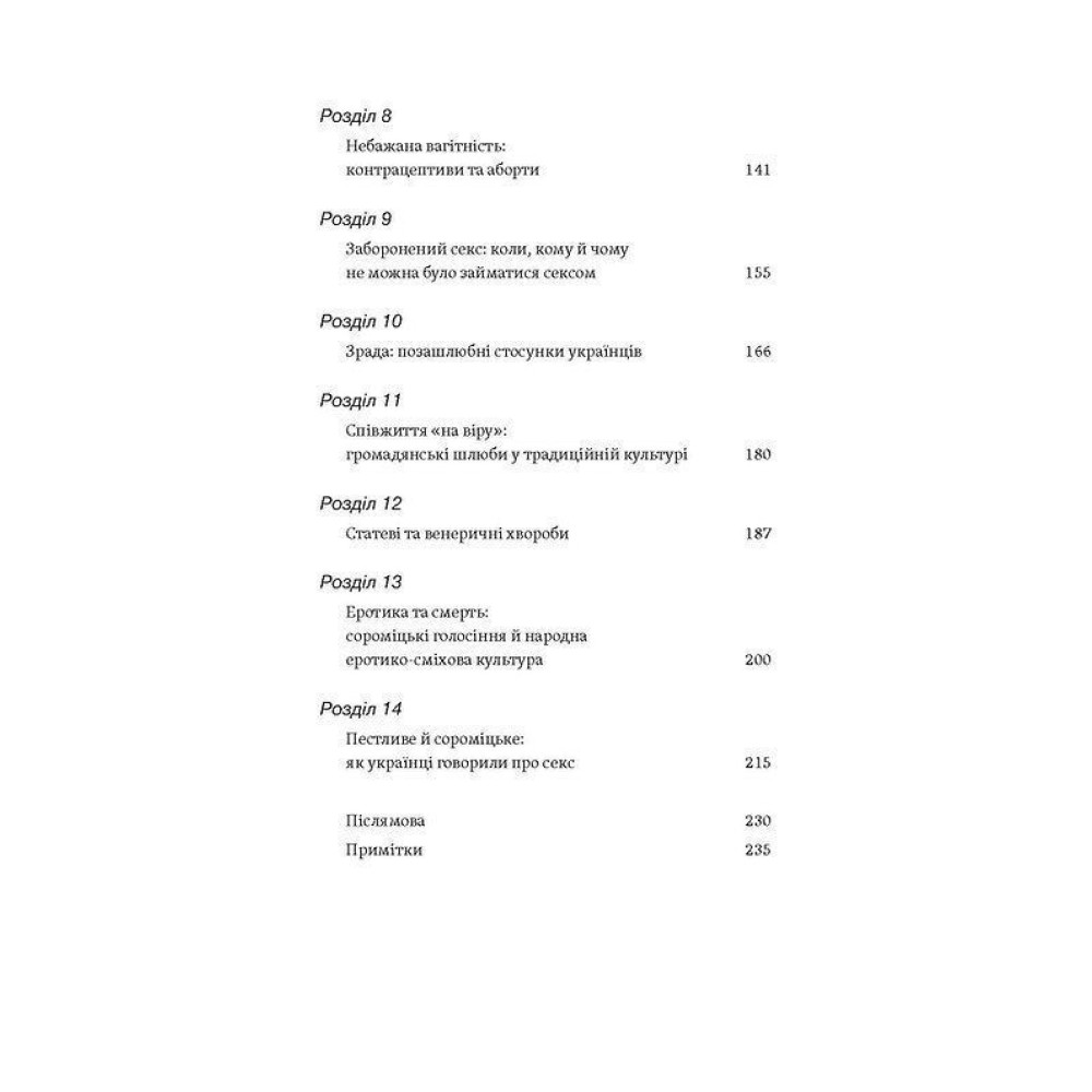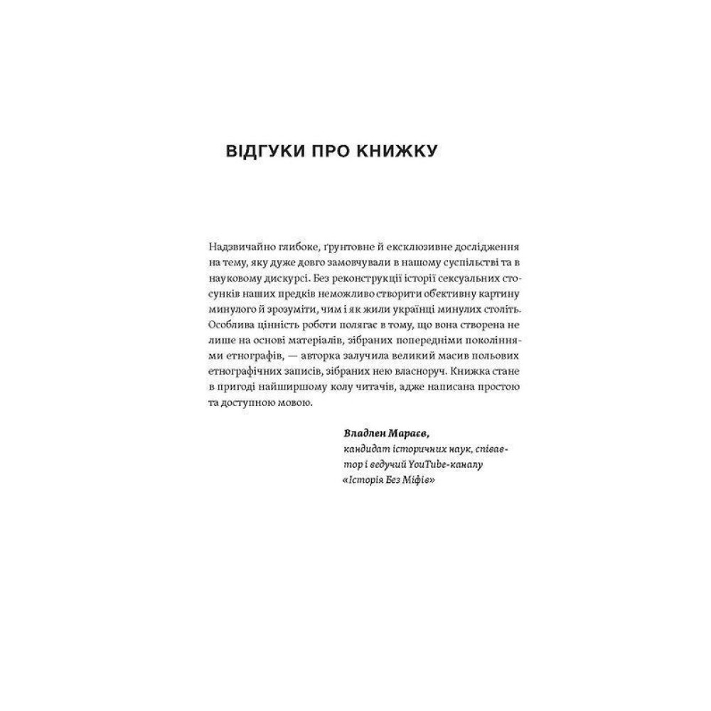 Дівоча честь і розпусні вечорниці. Весілля й обряд «комори». Повсюдні заборони та сороміцькі пісні. Картина того, якими були інтимні стосунки українців, справляє двояке враження, якщо спиратися лише на народний фольклор. Книга розкриває, як же все було насправді і як ми кохалися.