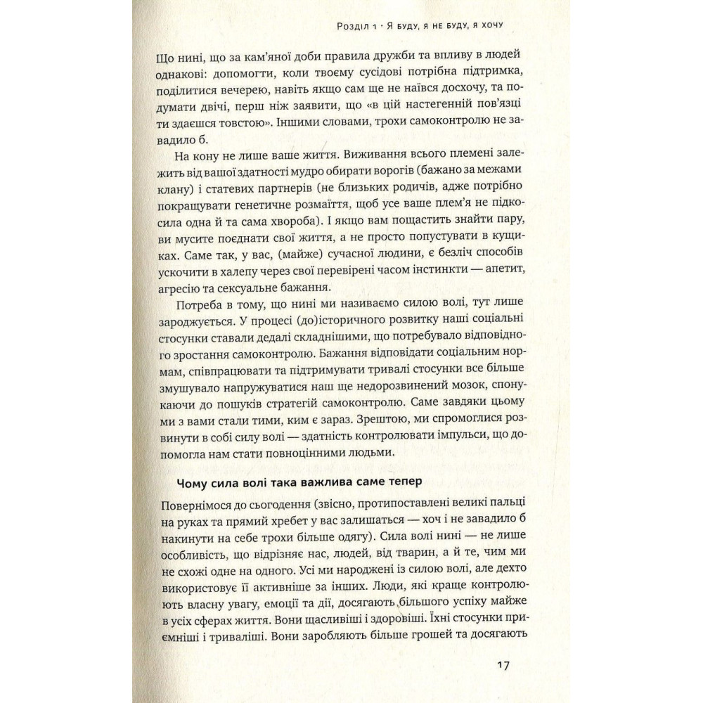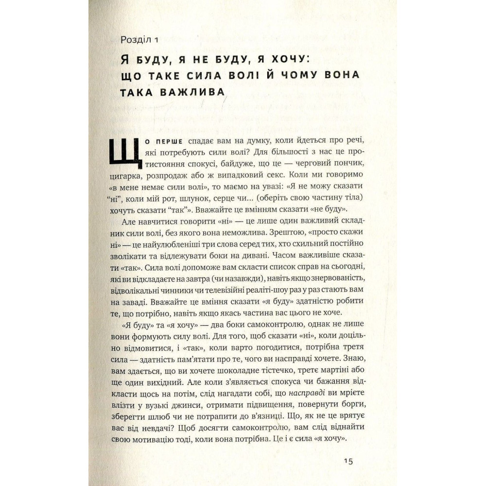 Авторка з наукового боку показує, як влаштовано наше мислення, чому ми уникаємо змін і сповна не використовуємо власний потенціал. Але, окрім теорії, Макґоніґал подає безліч фактів і цікавих прикладів. Та найбільша перевага книжки — це вправи. Виявляється, завдяки ним мозок можна натренувати, як м’язи.