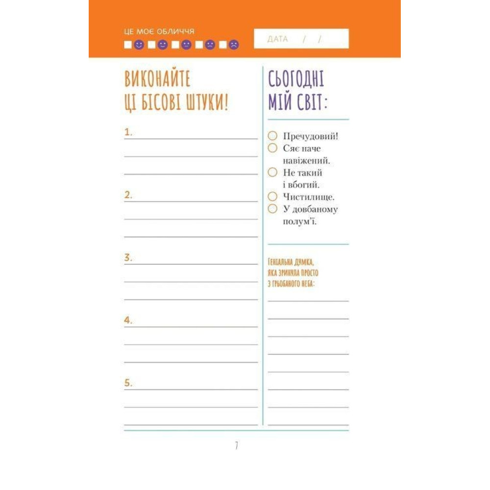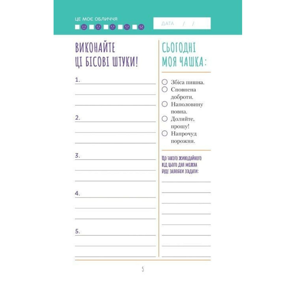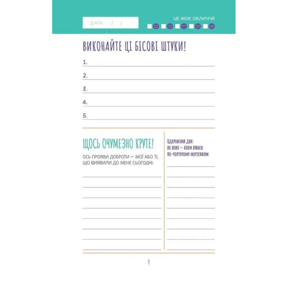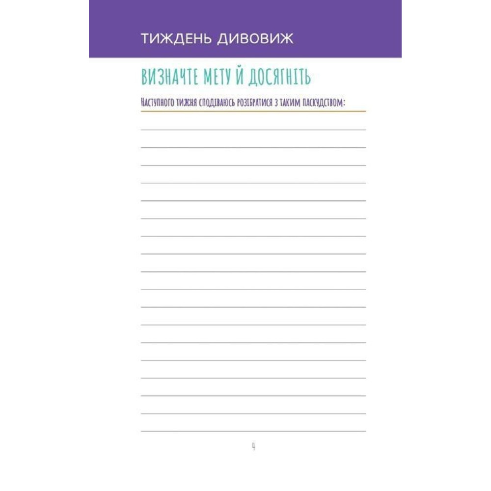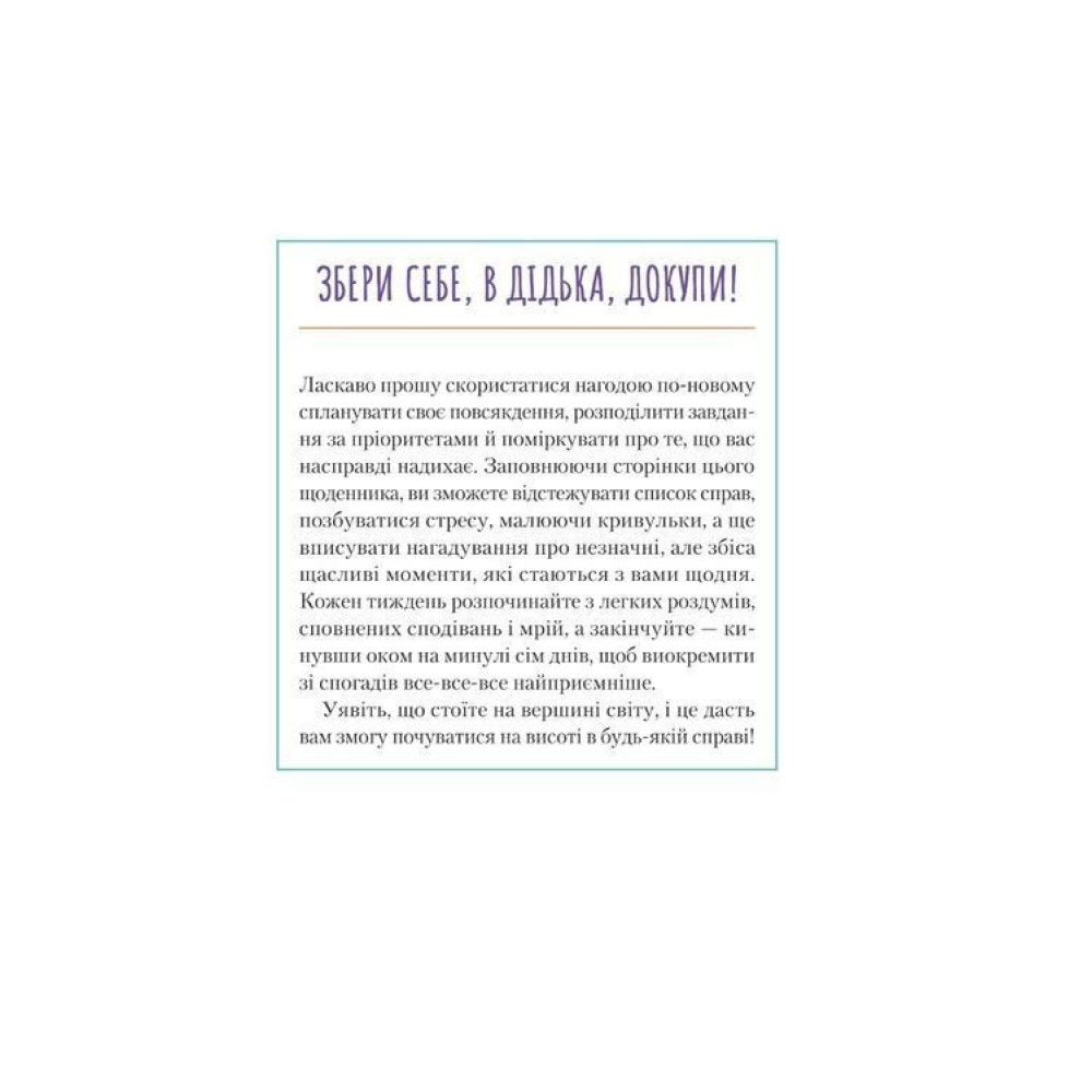 На початку кожного тижня ставте цілі й плануйте, як їх досягти, а тоді відстежуйте перелік завдань і позбувайтеся того, що дратує. Коли тиждень добігатиме кінця, у вас буде можливість підбити підсумки всьому, що вдалося зробити. Заповнюючи сторінки, присвячені дням і тижням, ви не втратите мотивації й почуватиметеся героєм. Завдяки цьому щоденнику ви опануєте науку планування і навчитеся позитивного ставлення, що їх так прагнули.