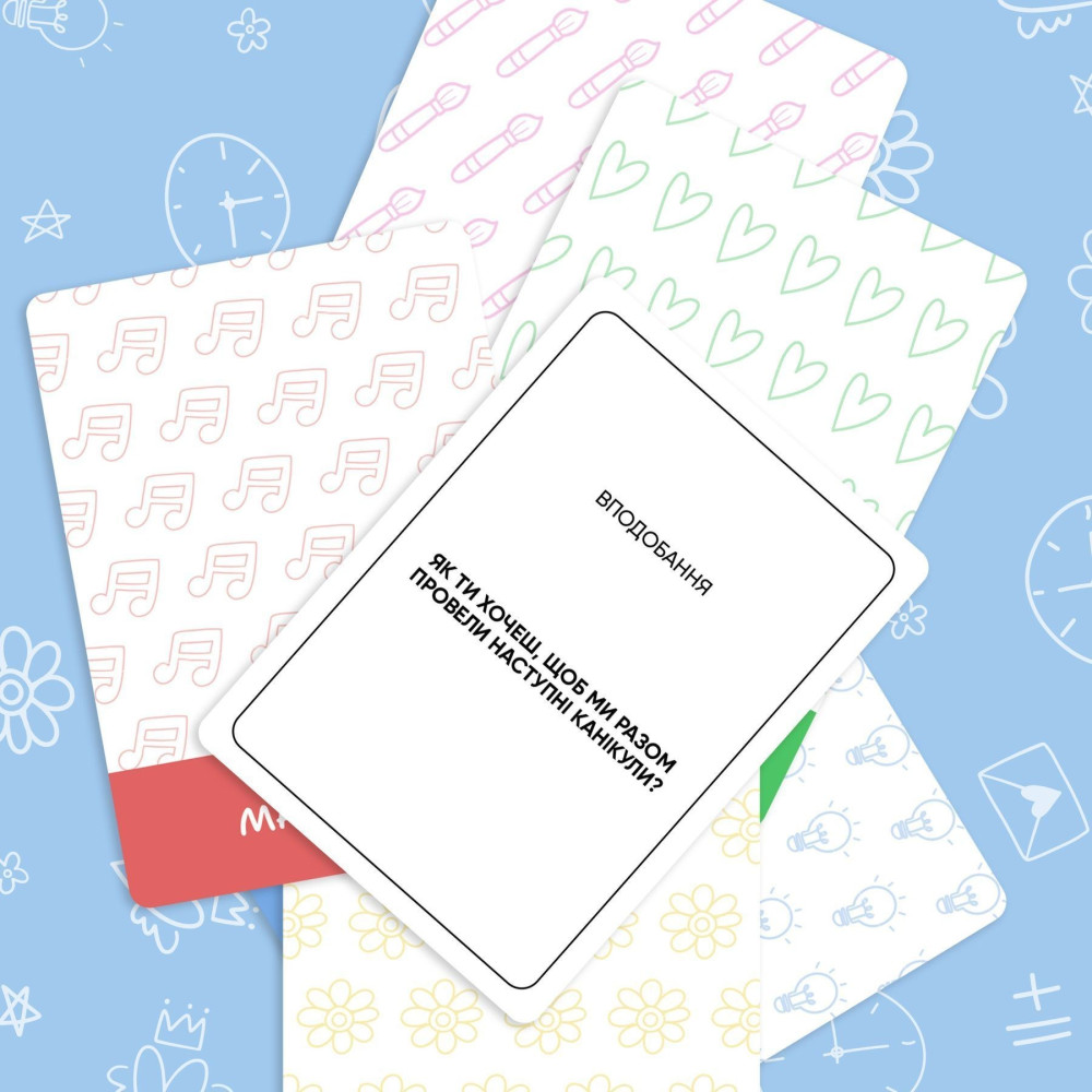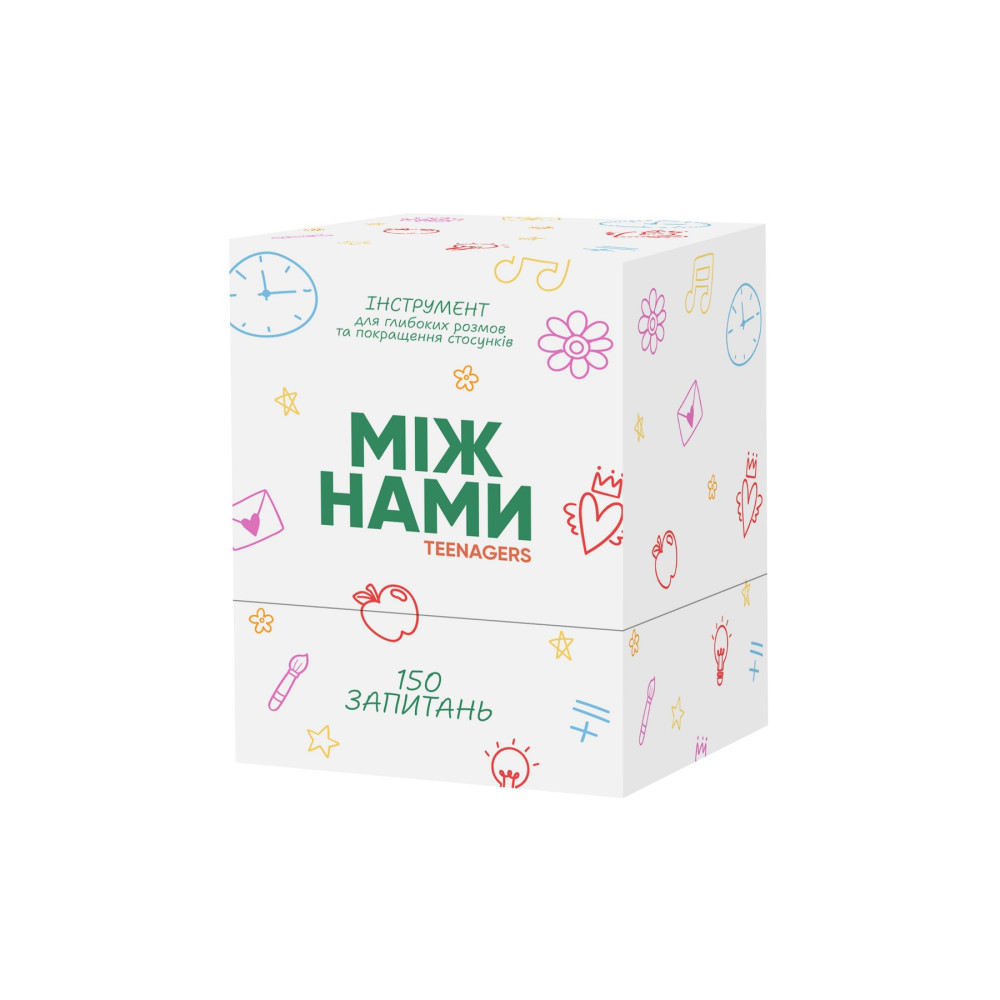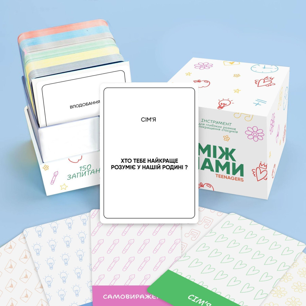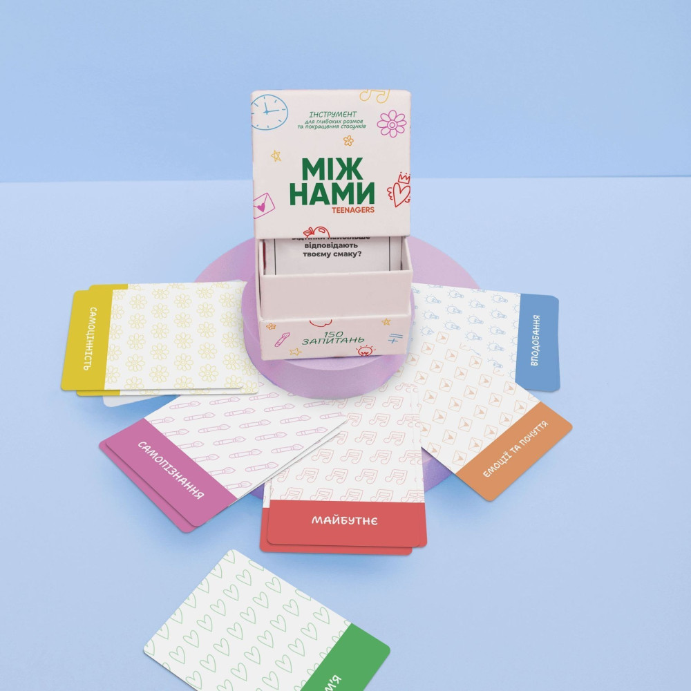 У коробці — продумані запитання та ситуації, що стимулюють розмови про почуття, самооцінку, дружбу, стосунки, кордони, мрії та страхи. Формат гри створює безпечний простір, де підліток може висловитися без тиску, а батьки, психологи або наставники — краще зрозуміти його внутрішній світ.