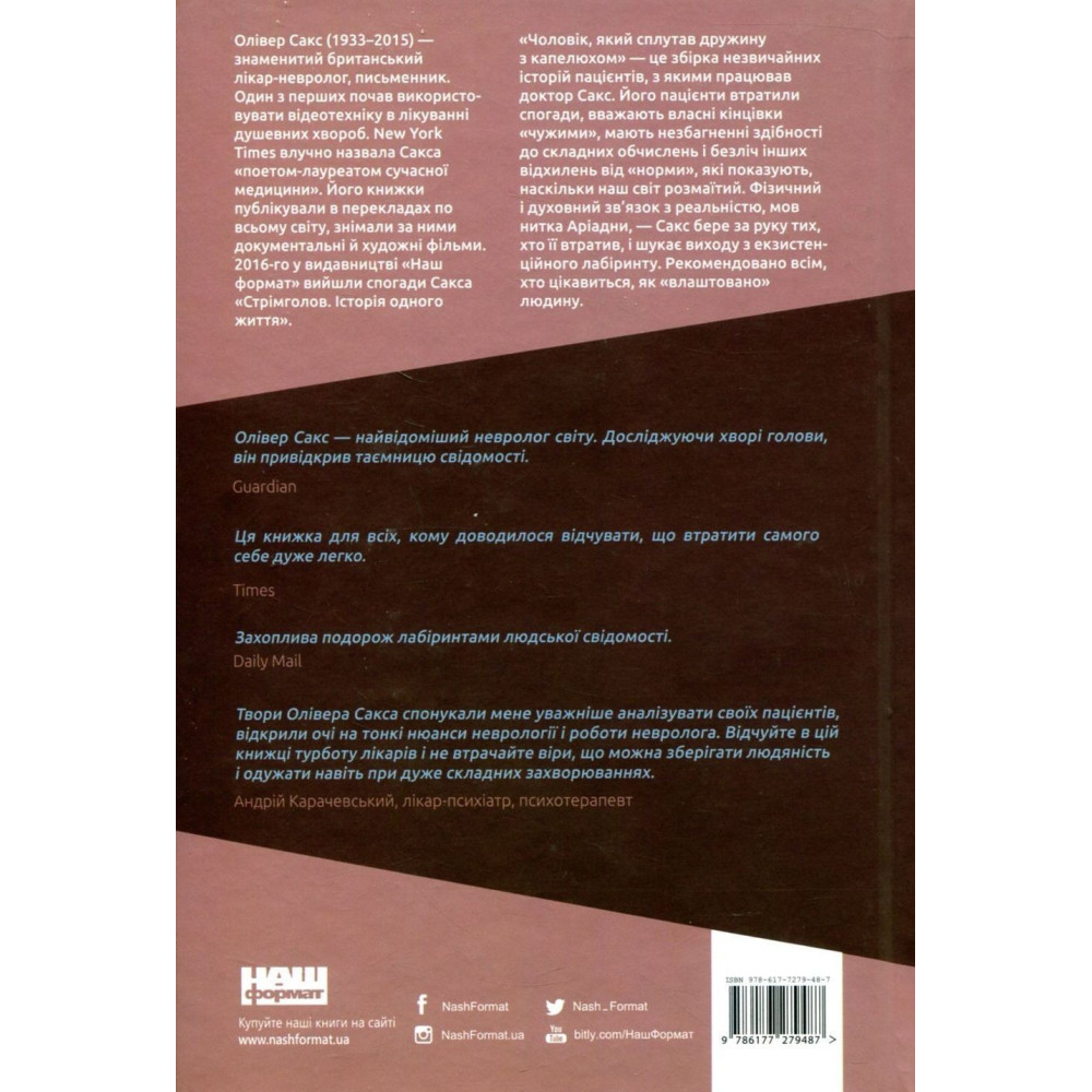 «Чоловік, який сплутав дружину з капелюхом, та інші історії з лікарської практики» — це збірка незвичайних історій пацієнтів, з якими працював доктор Олівер Сакс. Його пацієнти втратили спогади, вважають власні кінцівки «чужими», мають незбагненні здібності до складних обчислень і безліч інших відхилень від «норми», які показують, наскільки наш світ розмаїтий. Фізичний і духовний зв’язок з реальністю, мов нитка Аріадни, — Сакс бере за руку тих, хто її втратив, і шукає виходу з екзистенційного лабіринту.