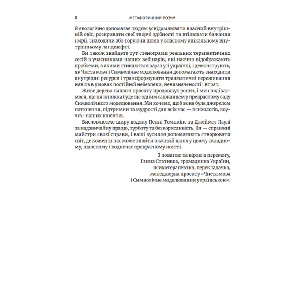 Лаулі й Томпкінс створили принцип Символічного моделювання, якого вони дійшли завдяки вдалій практиці в психотерапії. Цей принцип, а також інструмент «Чистої мови» вони використовують для ефективної терапії, що допомагатиме розвинути метафоричний розум. Для більш детального висвітлення вони використали стенограми власних сесій різних клієнтів із різної ступені захворюваннями психологічного характеру. Зараз це є особливо актуальним під час повномасштабної війни, коли населення знаходиться в пасивному стресі й вимушено звертатися до психотерапевтів — саме їм рекомендується ця книга, якщо вони хочуть бути обізнаними в сучасних методах психотерапії.