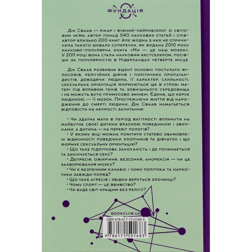 Дік Свааб — лікар та вчений-нейробіолог зі світовим ім’ям, який з 1978 по 2005 рік був керівником Нідерландського інституту головного мозку при Нідерландській королівській академії наук, почесний професор нейробіології в Університеті Амстердаму, лицар Ордену нідерландського лева — є автором більш ніж 540 наукових статей і співавтором близько 200 книг. Але жодна з них не викликала такого шквалу суперечок, як видана 2010 року науково-популярна книга «Ми — це наш мозок». У 2011 році вона стала науковим бестселером, посівши за популярністю в Нідерландах четверте місце. Сьогодні продано вже понад 300 тисяч примірників книги, яка знайшла свого читача в багатьох країнах світу.