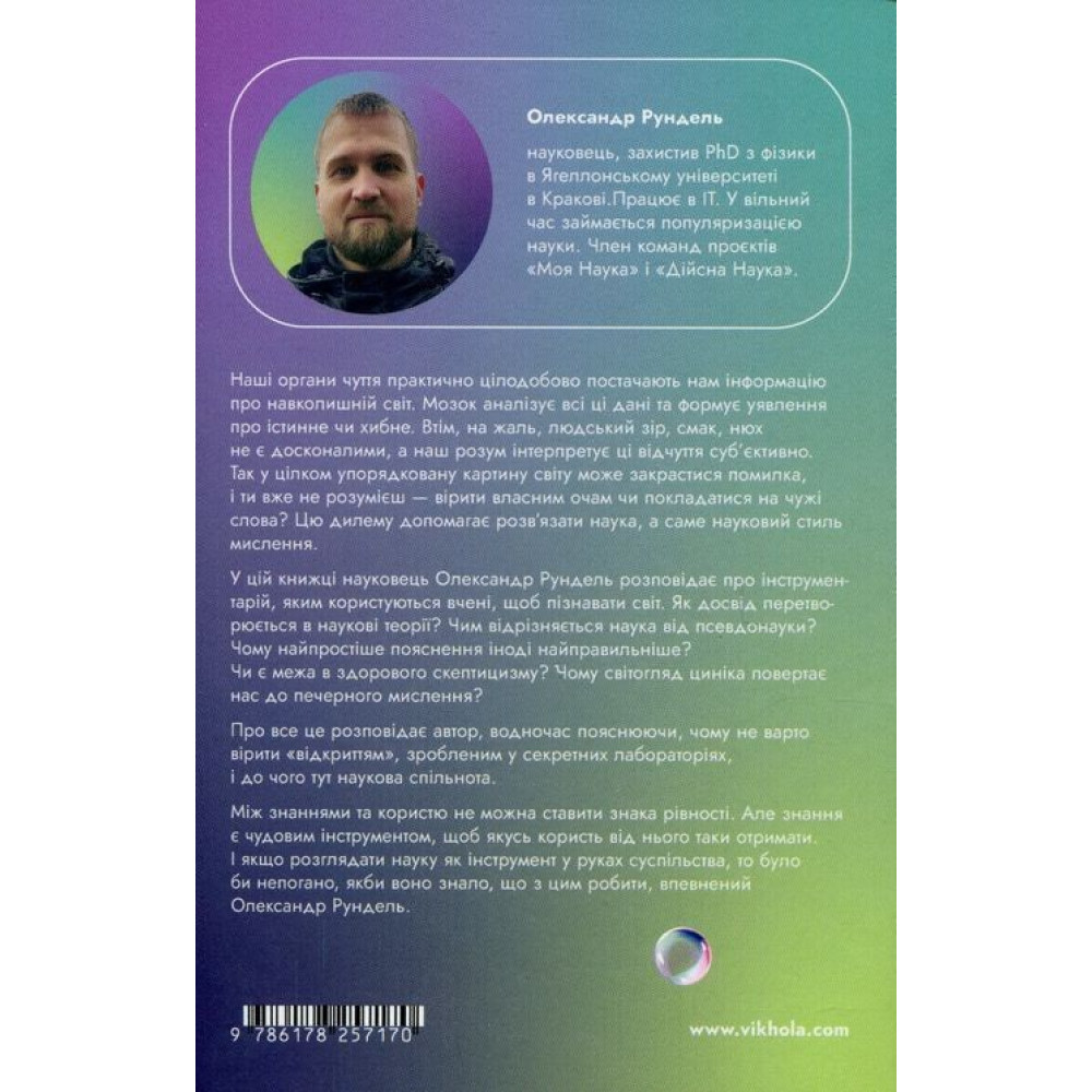 Олександр Рундель, автор книги «Наукове мислення. Аргументовані способи не приймати все на віру», упевнений, що наші органи чуття практично цілодобово постачають нам інформацію про навколишній світ, адже мозок аналізує всі ці дані та формує уявлення про істинне чи хибне. Втім, на жаль, людський зір, смак, нюх не є досконалими, а наш розум інтерпретує ці відчуття суб’єктивно. Так у цілком упорядковану картину світу може закрастися помилка, і ти вже не розумієш — вірити власним очам чи покладатися на чужі слова? Цю дилему допомагає розв’язати наука, а саме науковий стиль мислення.
