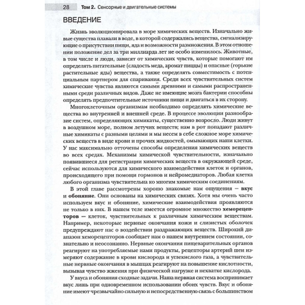 Нейронауки — новий напрям у дослідницькій діяльності, що об'єднує нейробіологію, хімію, фізику, психологію, фізіологію, когнітивістику і навіть філософію. У другому томі цього видання розглядаються основи сенсорних і рухових систем людини та розкриваються принципи й механізми, що відповідають за збирання, організацію й обробку інформації, яку людина отримує з довкілля за допомогою зору, слуху, нюху, смаку та дотику. Книга призначена для тих, хто вивчає медицину, нейробіологію, нейрофізіологію, а також для всіх, хто цікавиться нейронауками.