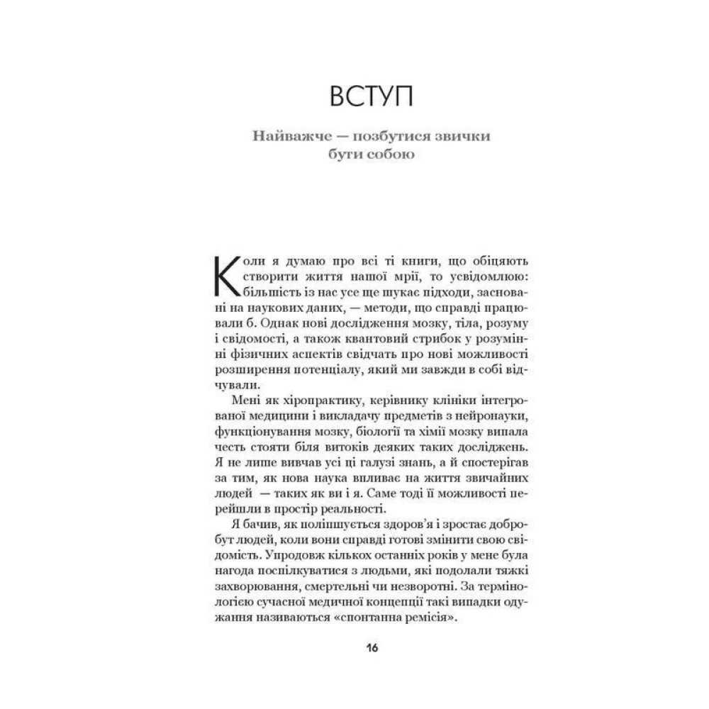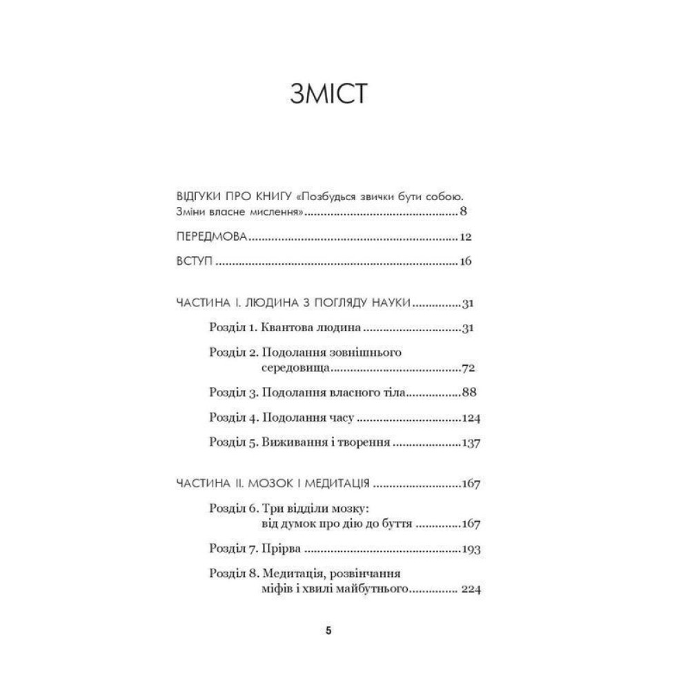 У книзі «Позбудься звички бути собою. Зміни власне мислення» відомий автор, оратор, дослідник і хіропрактик доктор Джо Диспенза поєднує знання із квантової фізики, нейрології, хімії мозку, біології та генетики, аби показати, що ми насправді можемо. Автор книги демістифікує стародавні вчення й долає прірву між наукою та духовністю. Він прагне дати читачам сили звільнитися від негативних переконань і замінити їх на позитивні. Ця глибока, змістовна і корисна книга допоможе віднайти найкраще й найвільніше «Я», щоб зробити крок назустріч власній долі.