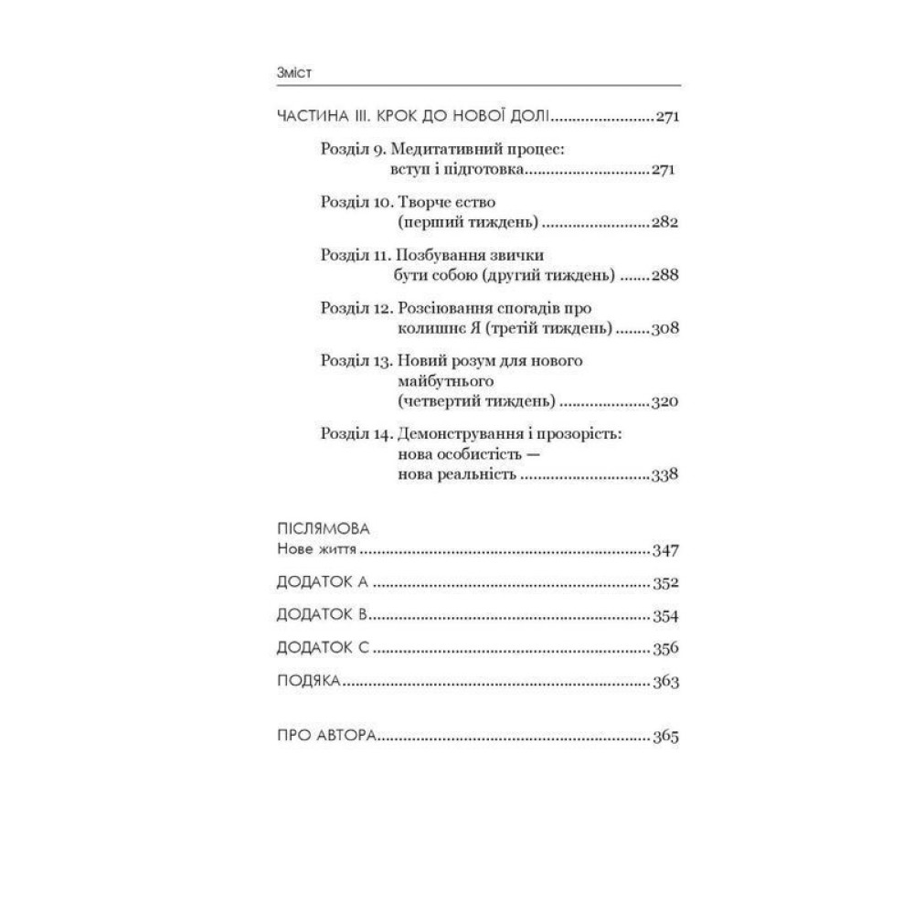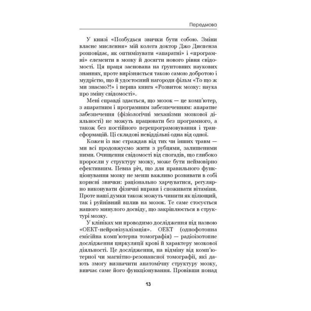 Цікавий і доступний посібник із перепрограмування наших ментальних та емоційних систем містить просте, але потужне послання: те, про що ми думаємо сьогодні, визначає те, яким буде наше життя завтра. Доктор Джо Диспенза майстерно й водночас дуже доступно пояснює складні наукові аспекти роботи мозку і тіла. Автор застосовує ці знання на практиці й пропонує чотиритижневу програму докорінної трансформації особистості, під час якої читачі навчаться використовувати структуровану програму медитації, свідомо перепрограмовувати свою нейронну мережу, крім того, розкривати творчий потенціал, щоб сповна насолоджуватися життям.