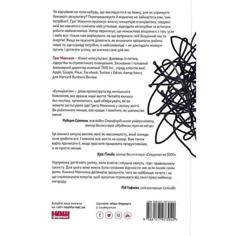 Але є й добра новина — книжка Ґреґа Маккеона «Есенціалізм. Мистецтво визначати пріоритети» допоможе із цим впоратися та відкриє для вас шлях есенціаліста. Ні, це не чергова псевдофілософія, стратегія управління часом або техніка продуктивності. Це системна дисципліна, завдяки якій ви навчитеся визначати пріоритети, робити лише найважливіше і безжально відкидати усе непотрібне.