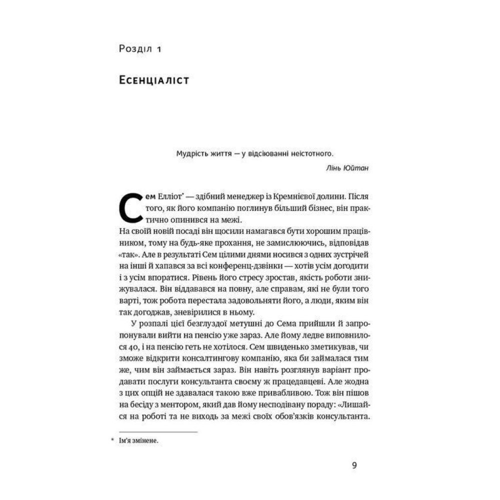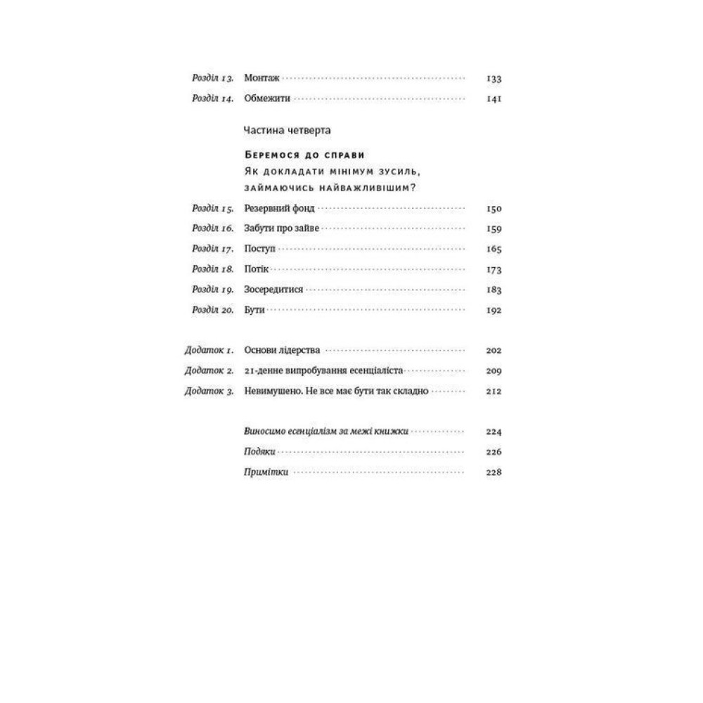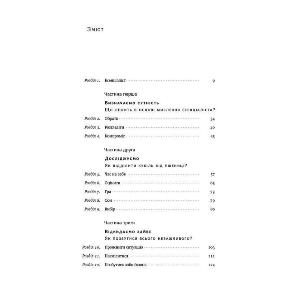 Автор доводить, що неможливо встигнути і мати все, але ми можемо обирати, куди направляти свій час і енергію, поки хтось не вибрав це за нас. Шлях есенціаліста — це абсолютно новий погляд на життя, це дорога, яка приведе не тільки до успіху, а й до внутрішньої гармонії.
