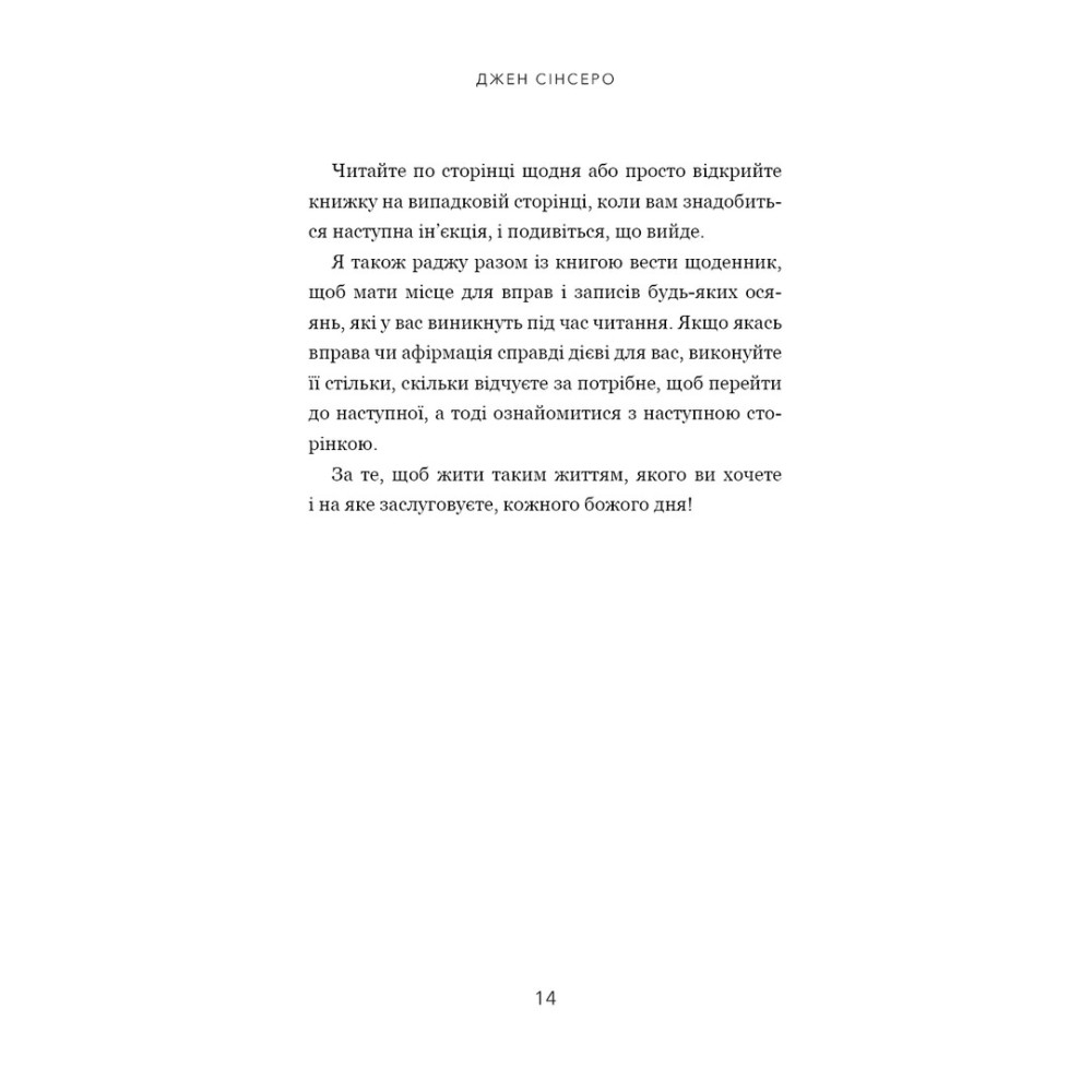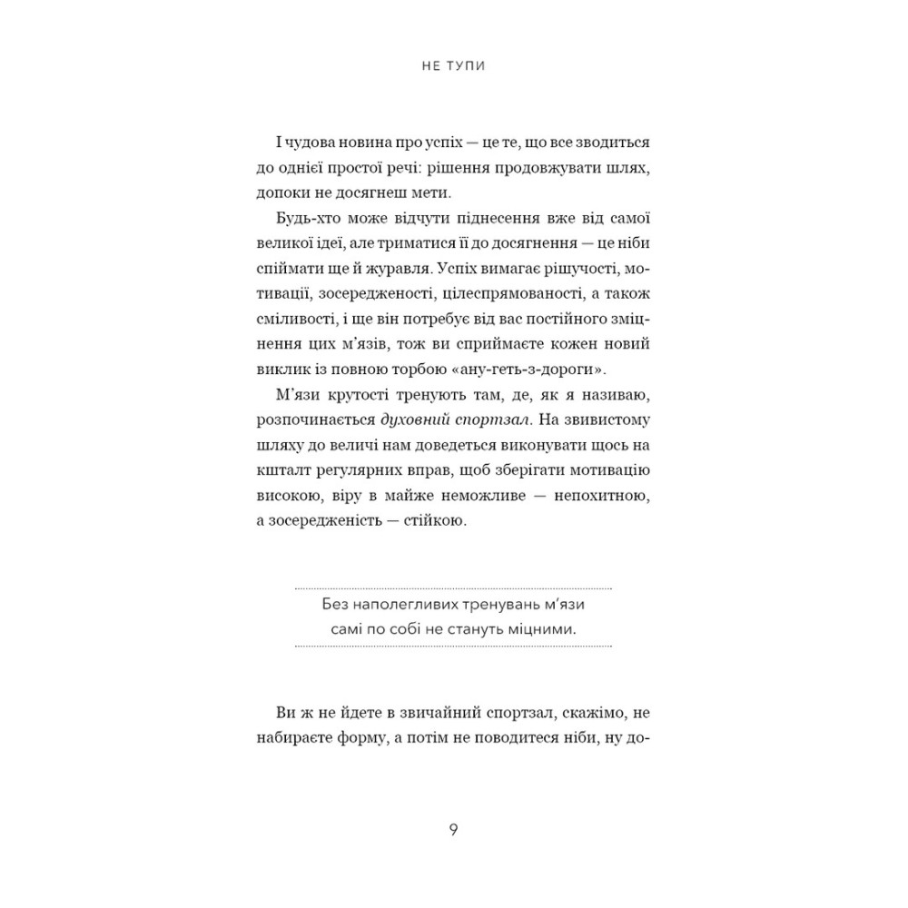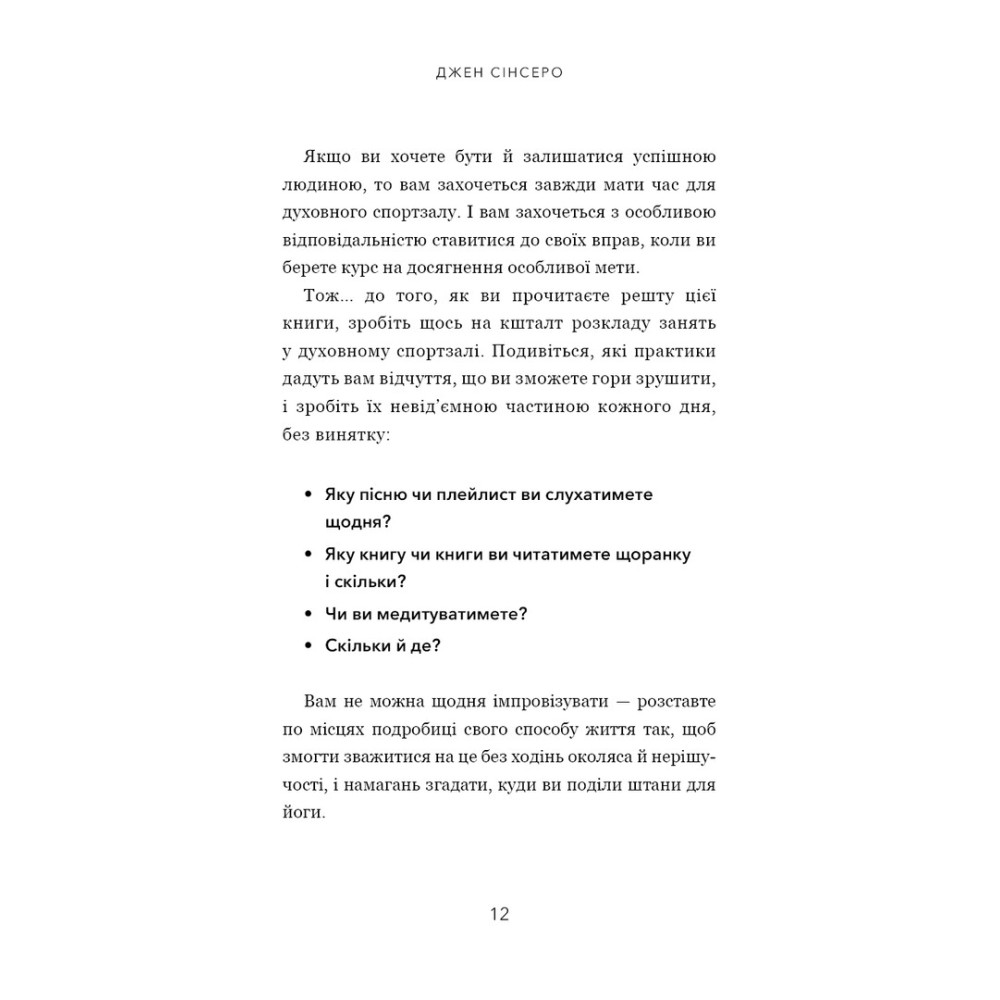 Щоб досягти успіху, теж треба виконувати певні вправи. Це наче відвідування духовного спортзалу. У цій книзі ви знайдете багато вправ для досягнення успіху й здійснення мрій, тож після її прочитання складіть розклад занять у своєму духовному спортзалі. Певні практики вам відгукнуться, і ви зробите їх щоденними звичками, тоді як інші виконуватимете лише час від часу.