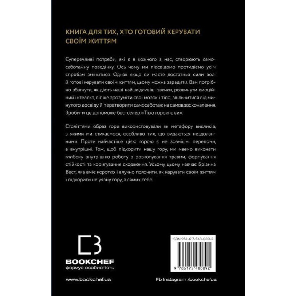 Саме суперечливі потреби, які є в кожного з нас, створюють самосаботажну поведінку. Ось чому ми підсвідомо протидіємо усім спробам змінитися. Однак якщо ви маєте достатньо сили волі й готові керувати своїм життям, цьому можна зарадити. Вам потрібно збагнути, як діють наші найшкідливіші звички, розвинути емоційний інтелект, ліпше зрозуміти свої мозок і тіло, звільнитися від минулого досвіду на клітинному рівні й перетворити самосаботаж на самовдосконалення. Зробити це допоможе бестселер Бріанни Вест — «Тією горою є ви. Як перетворити самосаботаж на самовдосконалення».